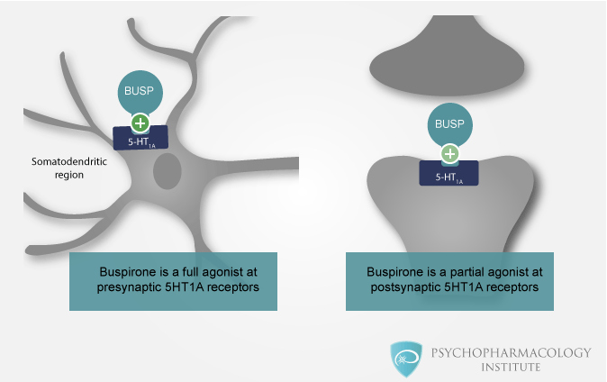 Buspirone is an azapirone that was originally thought to achieve its anxiolytic effects solely through D2 receptor antagonistic mechanisms. It was later discovered that buspirone specifically displaces 8- OH-DPAT from 5-HT1A receptor binding sites, in addition to some D2 receptor antagonist activity [1]. Further investigation has revealed that buspirone acts at both: