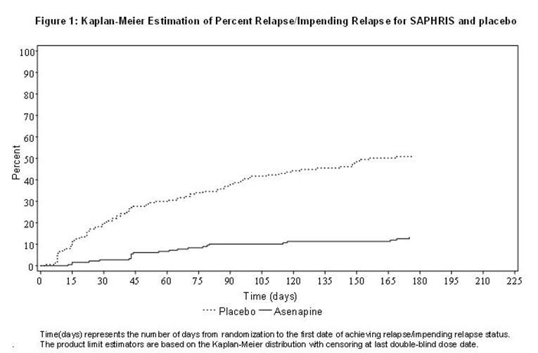 Maintenance of efficacy has been demonstrated in a placebo-controlled, double-blind, multicenter, flexible dose (5 mg or 10 mg twice daily based on tolerability) clinical trial with a randomized withdrawal design. A total of 700 patients entered open-label treatment with SAPHRIS for a period of 26 weeks. Of these, a total of 386 patients who met pre-specified criteria for continued stability (mean length of stabilization was 22 weeks) were randomized to a double-blind, placebo-controlled, randomized withdrawal phase. SAPHRIS was statistically superior to placebo in time to relapse or impending relapse defined as increase in PANSS ≥20% from baseline and a Clinical Global Impression–Severity of Illness (CGI-S) score ≥4 (at least 2 days within 1 week) or PANSS score ≥5 on “hostility” or “uncooperativeness” items and CGI-S score ≥4 (≥2 days within a week), or PANSS score ≥5 on any two of the following items: “unusual thought content,” “conceptual disorganization,” or “hallucinatory behavior” items, and CGI-S score ≥4 (≥2 days within 1 week) or investigator judgment of worsening symptoms or increased risk of violence to self (including suicide) or other persons. The Kaplan-Meier curves of the time to relapse or impending relapse during the double-blind, placebo-controlled, randomized withdrawal phase of this trial for SAPHRIS and placebo are shown in Figure 1.