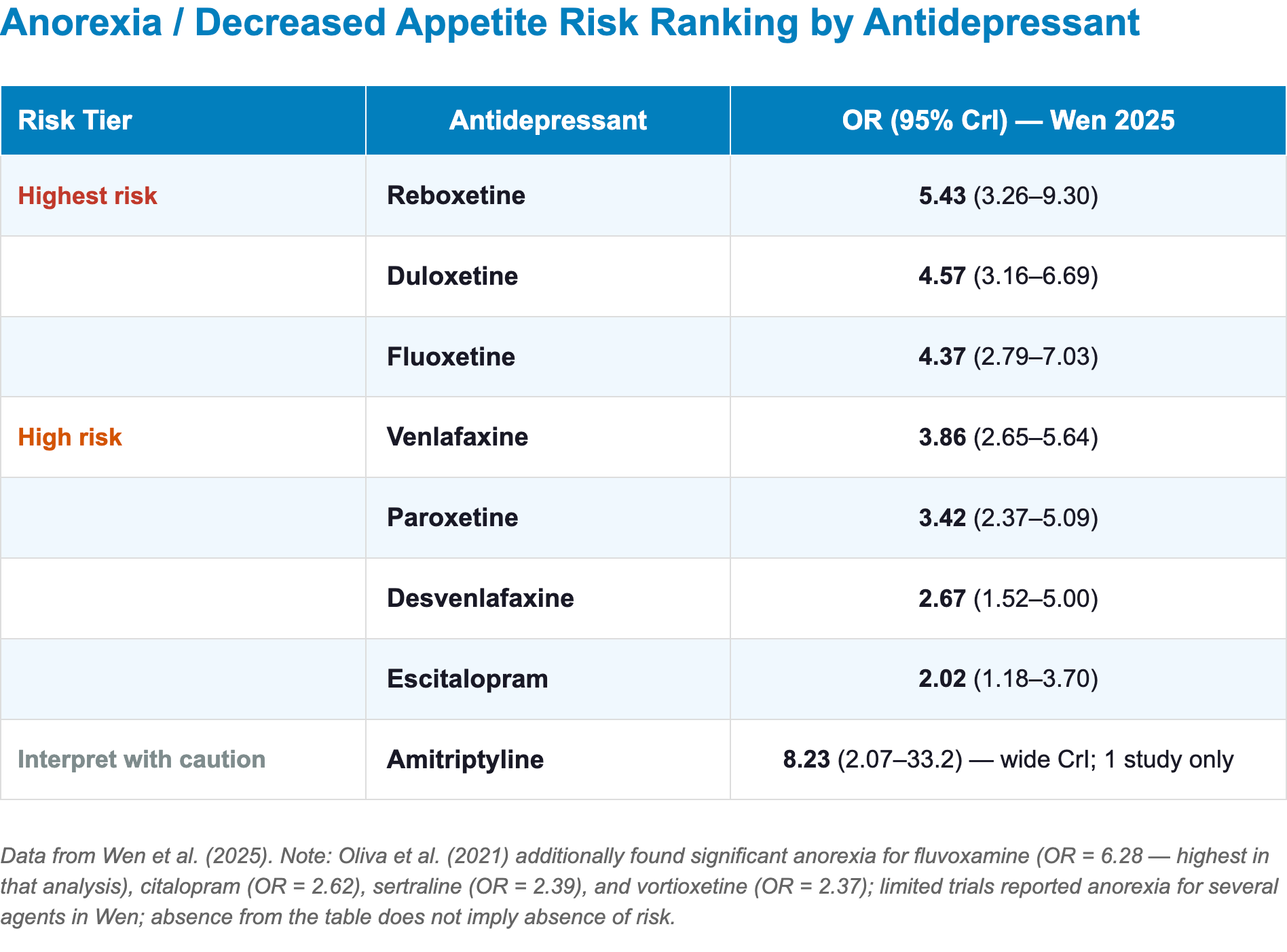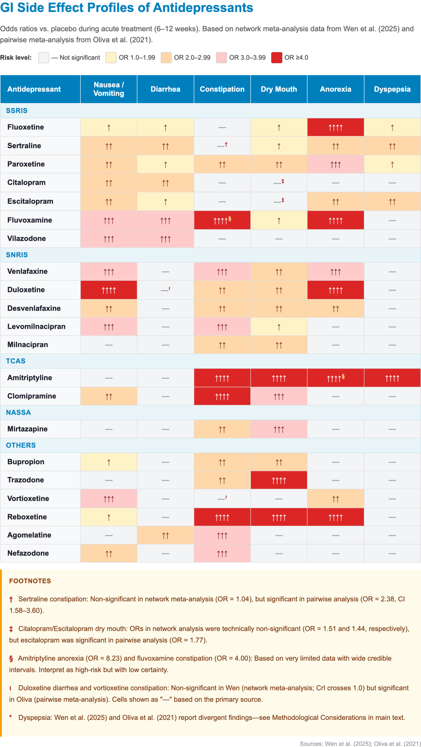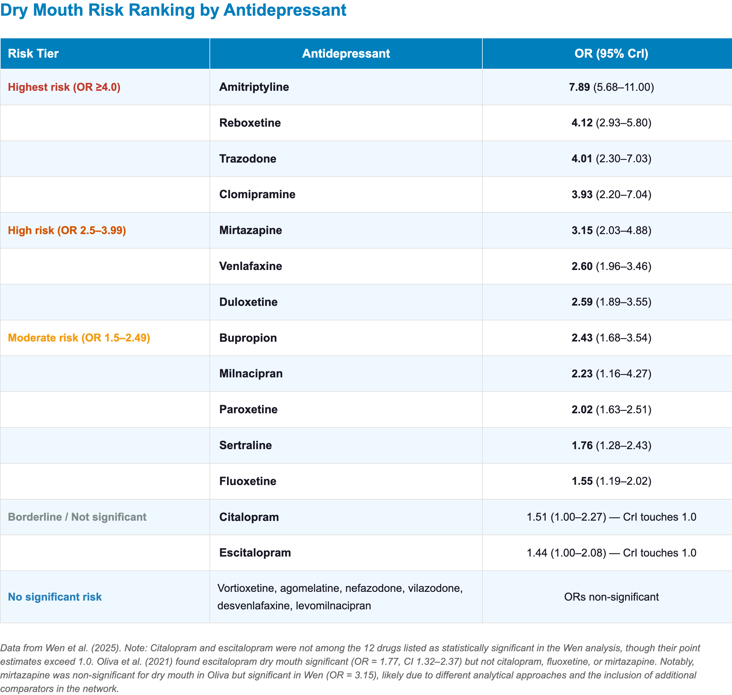 - Note: Mirtazapine showed significant dry mouth in the Wen analysis (OR 3.15) despite being non-significant in Oliva; caution is warranted when switching specifically for xerostomia [3,52]