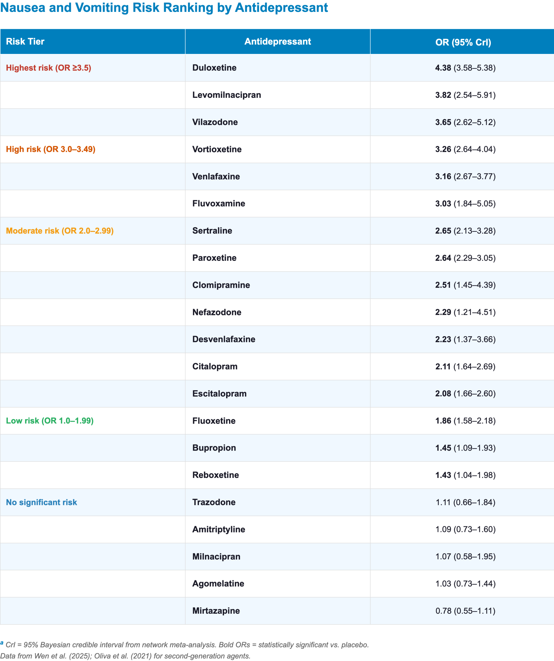 - Highest nausea risk: Duloxetine, levomilnacipran, vilazodone