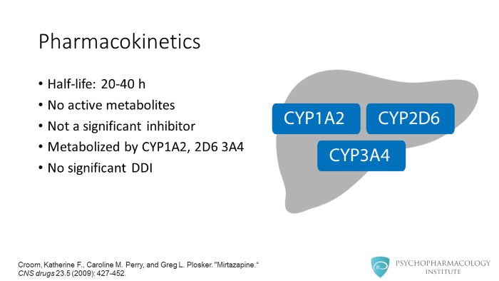 Mirtazapine has a half-life of 20 to 40 hours. It has no active metabolites and doesn’t inhibit significantly any CYP 450 isoenzyme. It is metabolized by three CYP 450 isoenzyme 1A2, 2D6 and 3A4. It has no significant drug-drug interactions, which makes it attractive for its use in combination with other antidepressants.