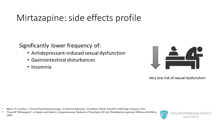 Mirtazapine has some advantages in terms of its side effects profile. When compared to SSRIs or SNRIs, mirtazapine is associated with significantly lower frequency of antidepressant-induced sexual dysfunction, gastrointestinal disturbances and insomnia.