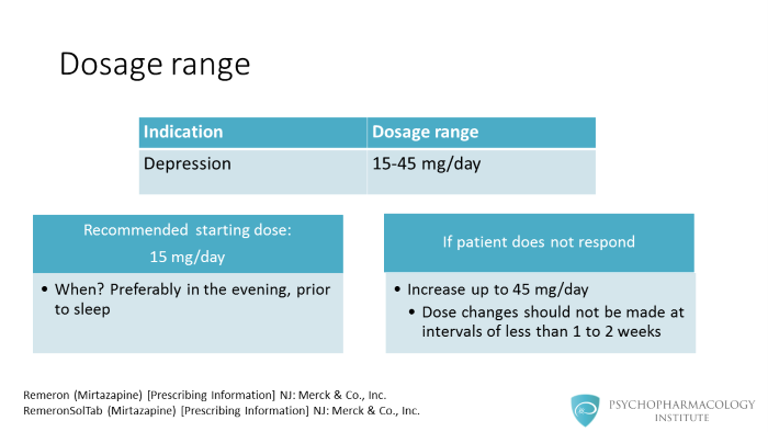 Mirtazapine’s dosage range goes from 15 to 45 mg/day. The recommended starting dose is of 15 mg/day . Because of mirtazapine’s sedative properties it is given preferably in the evening, prior to sleep. If the patient doesn’t respond, the manufacturer recommends dose increases up to a maximum of 45 mg/day. These dose changes should not be made at intervals of less than 1 to 2 weeks.