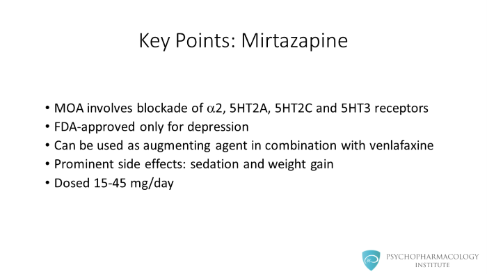The key points for this presentation are the following: • Mirtazapine’s mechanism of action involves blockade of alpha 2, 5HT2A, 5HT2C and 5HT3 receptors. • Mirtazapine is FDA-approved only for depression, but there is evidence of efficacy for anxiety disorders and negative symptoms of schizophrenia. • It can be used as augmenting agent in combination with venlafaxine. • Prominent side effects include sedation and weight gain. • It is dosed between 15-45 mg/day. This tutorial is also available in spanish: