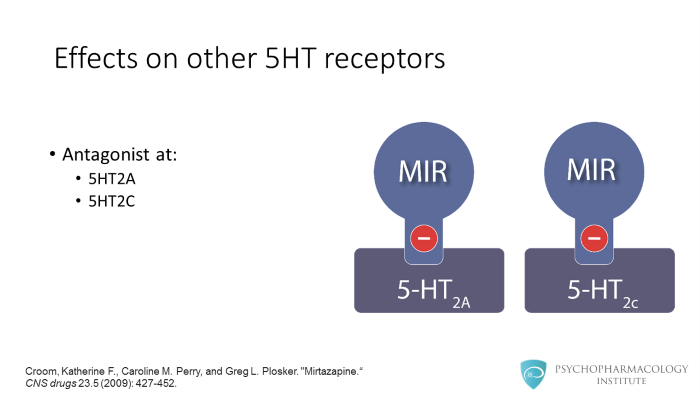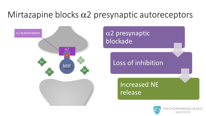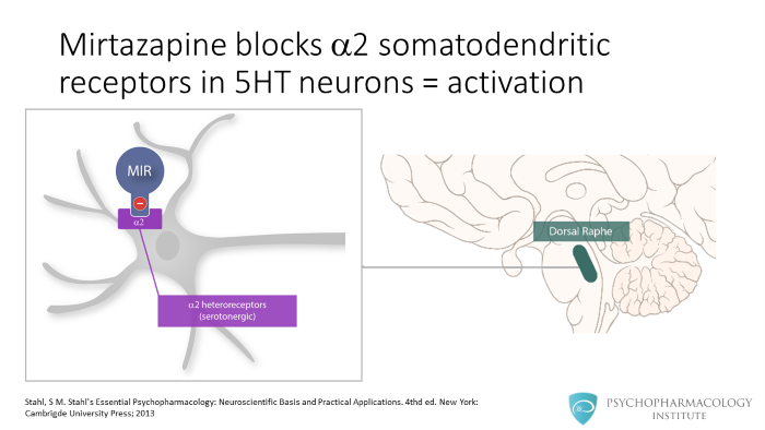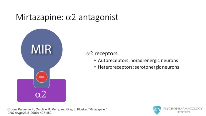 As I mentioned, mirtazapine is an alpha 2 antagonist. It blocks alpha 2 autoreceptors in noradrenergic neurons and alpha 2 heteroreceptors in serotonergic neurons.