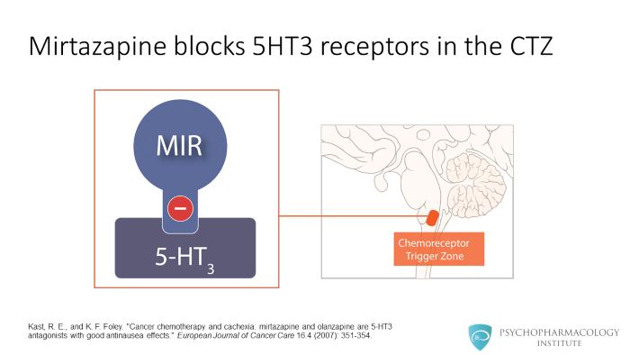 Mirtazapine blocks serotonin receptors, in this image the 5HT3 receptor is shown. Activation 5HT3 receptors at the chemoreceptor trigger zone is linked to vomiting. 5HT3 antagonism can be beneficial in cancer patients suffering from nausea and vomiting associated with chemotherapy.