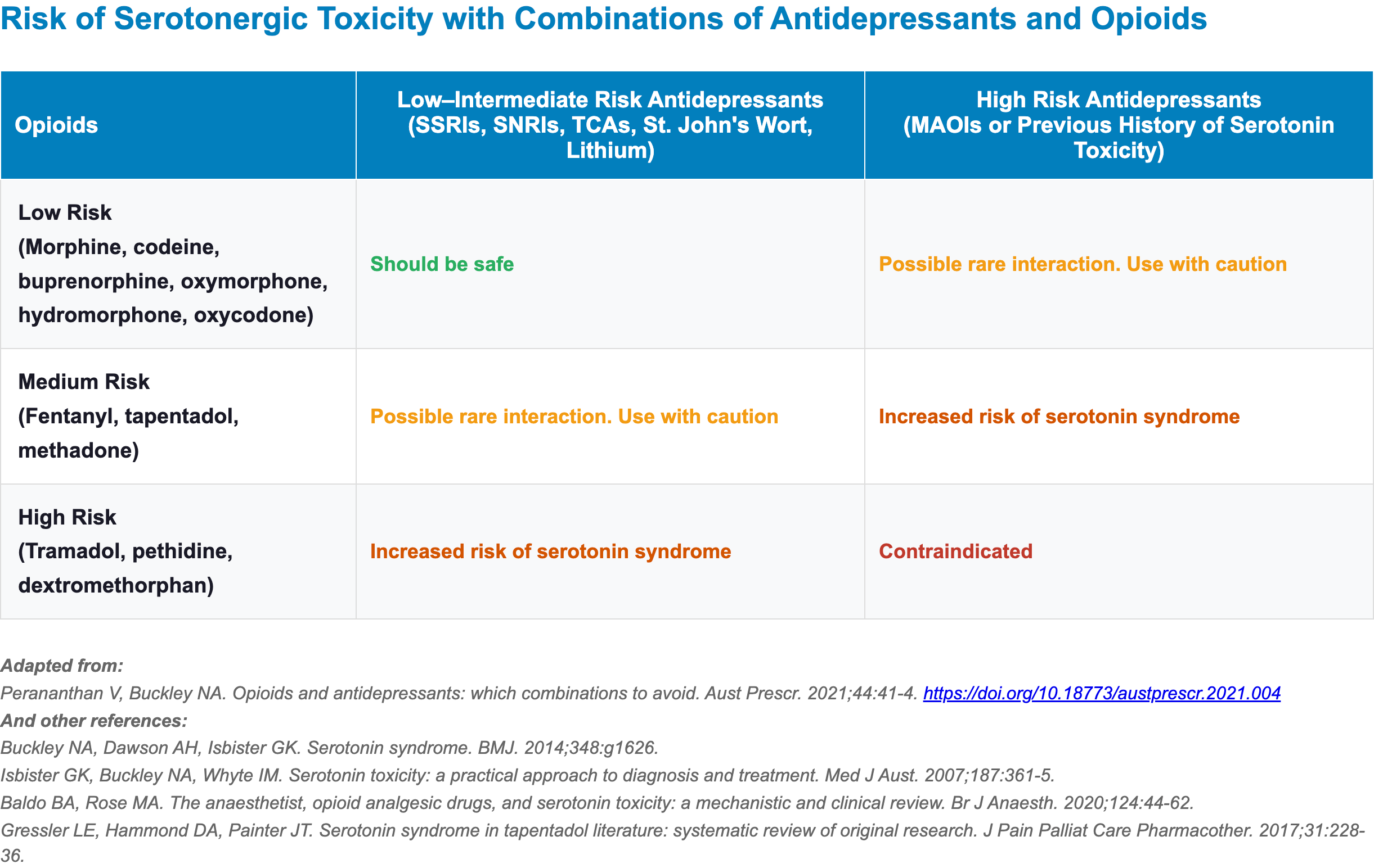 29. Perananthan, V., & Buckley, N. A. (n.d.). Opioids and antidepressants: Which combinations to avoid. https://doi.org/10.18773/austprescr.2021.004