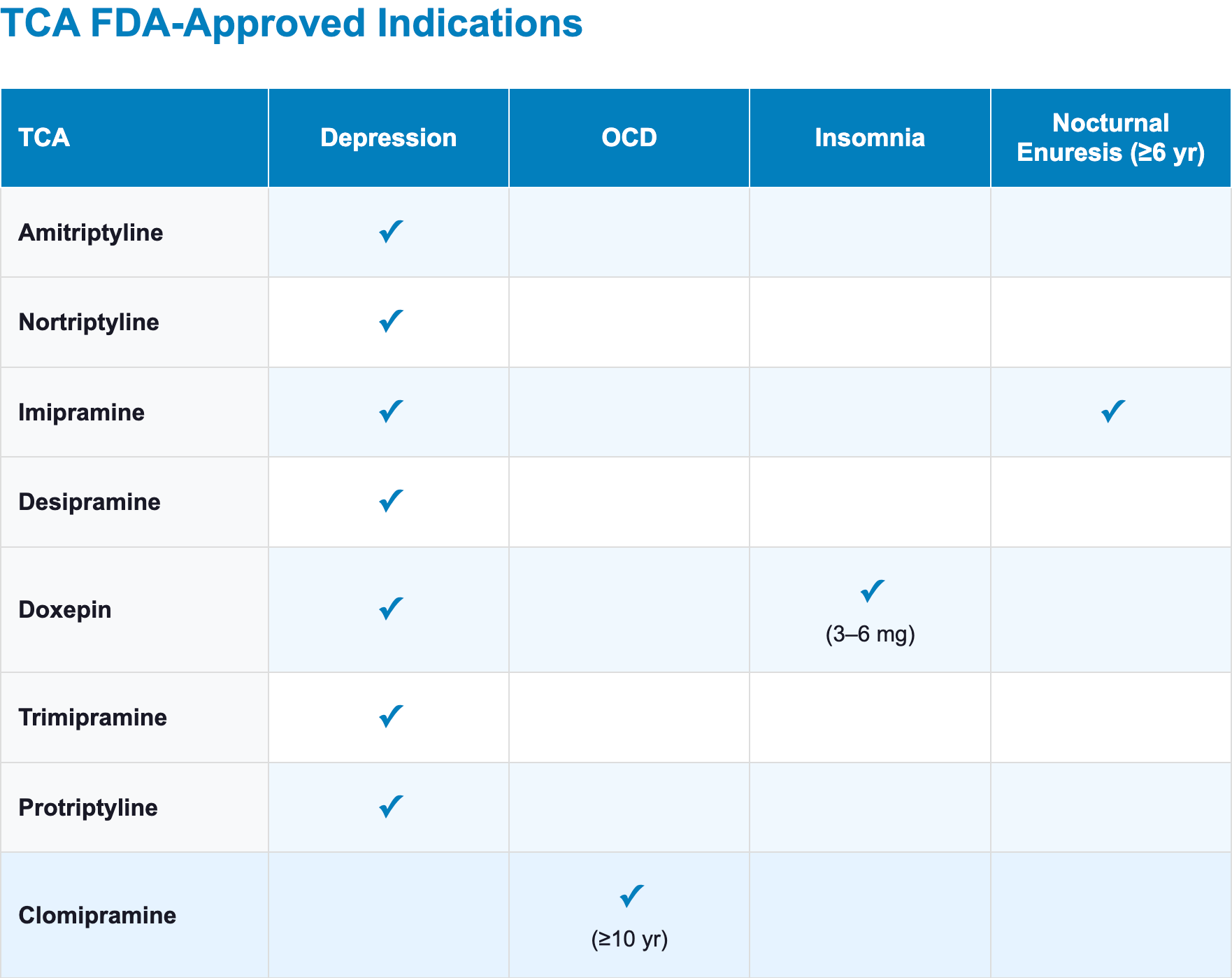 - Clomipramine is the only TCA with an FDA-approved indication for OCD (ages ≥10 years) [4,12]