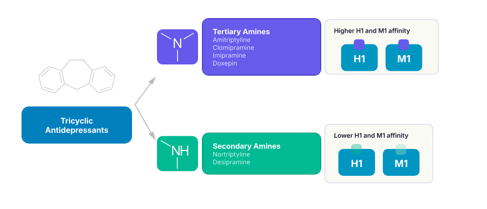 - Tertiary amines (amitriptyline, clomipramine, doxepin, imipramine, trimipramine)