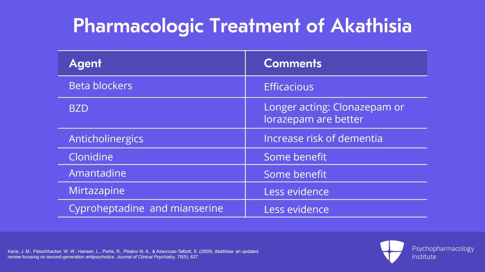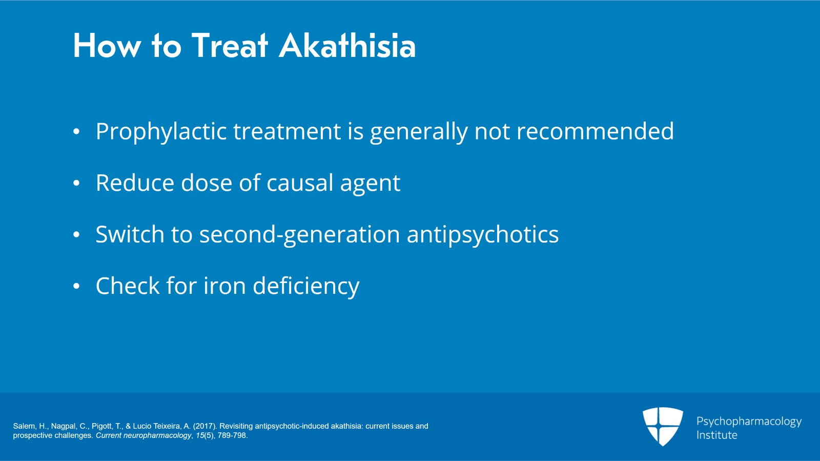 And then treating akathisia may include reducing the dose of the causal agent or switching treatment for ones that have a lower liability for causing the akathisia. And then finally, if these things don’t work or not clinically tenable, add a medication to treat akathisia.