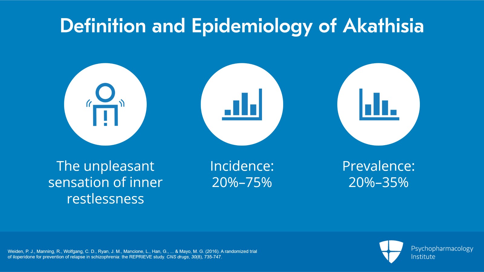 It’s a syndrome that’s often characterized by the inner feeling that one has to move or fidget and people will often shuffle their feet or shift in their chair or get up and pace. The incidence is between 21% and 75% onset after exposure to the drug per year. The prevalence is somewhere between 1 in 5 and maybe as high as 35% or more of patients will develop akathisia when exposed to the medications that cause it.
