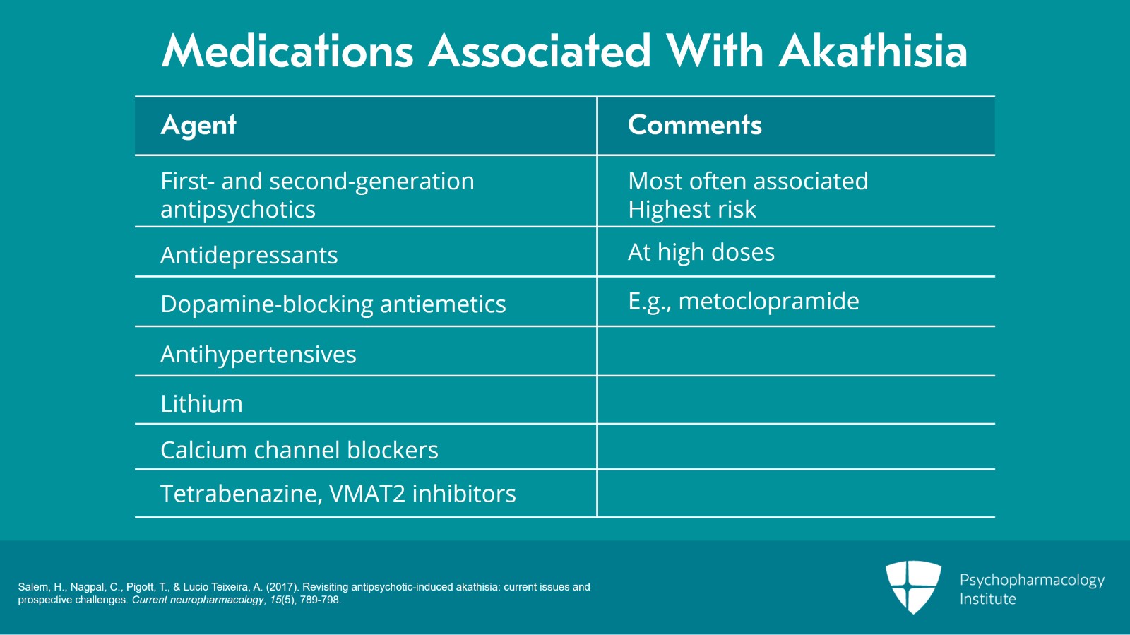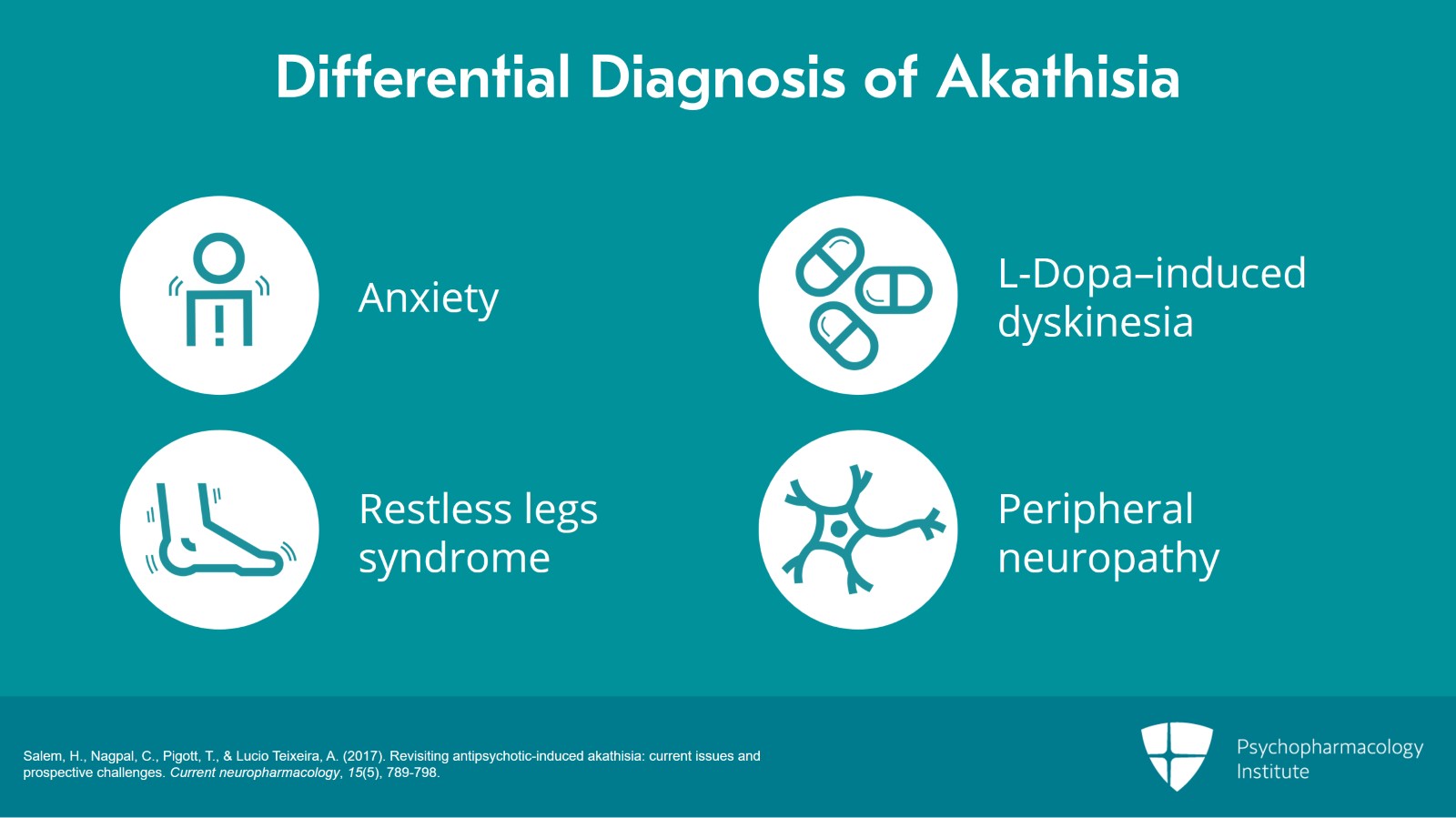 - Salem, H., Nagpal, C., Pigott, T., & Lucio Teixeira, A. (2017). Revisiting antipsychotic-induced akathisia: current issues and prospective challenges. Current neuropharmacology, 15(5), 789-798.