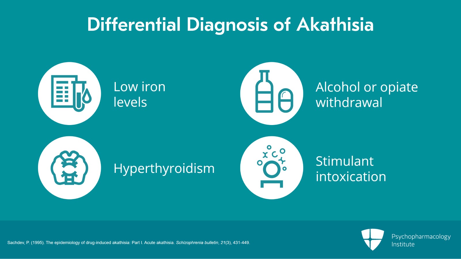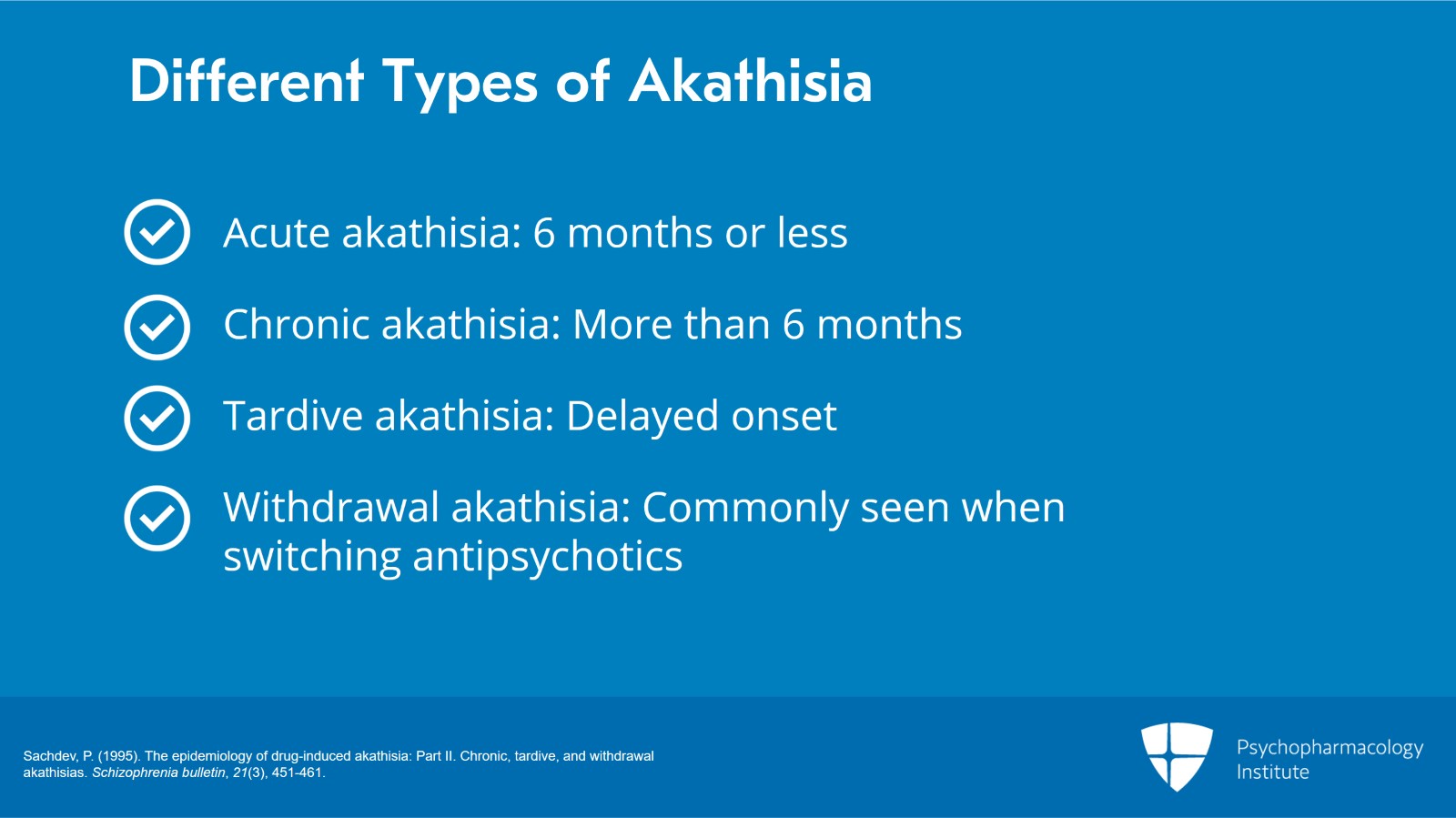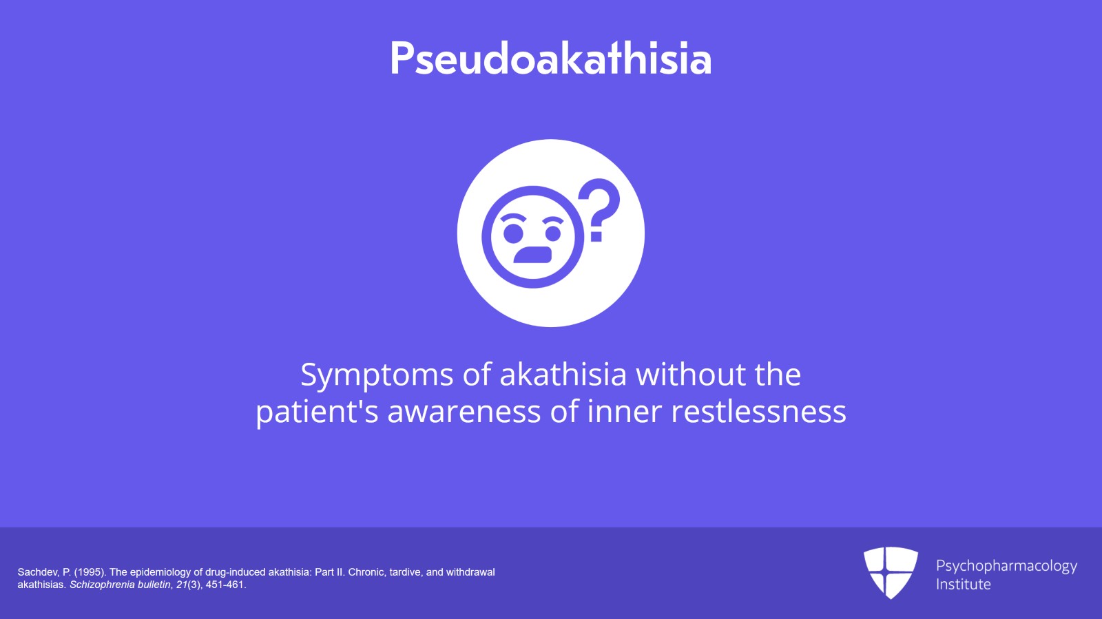 - Sachdev, P. (1995). The epidemiology of drug-induced akathisia: Part I. Acute akathisia. Schizophrenia bulletin, 21(3), 431-449.