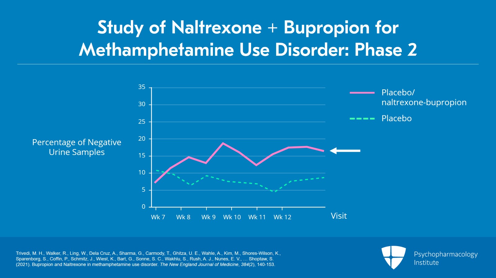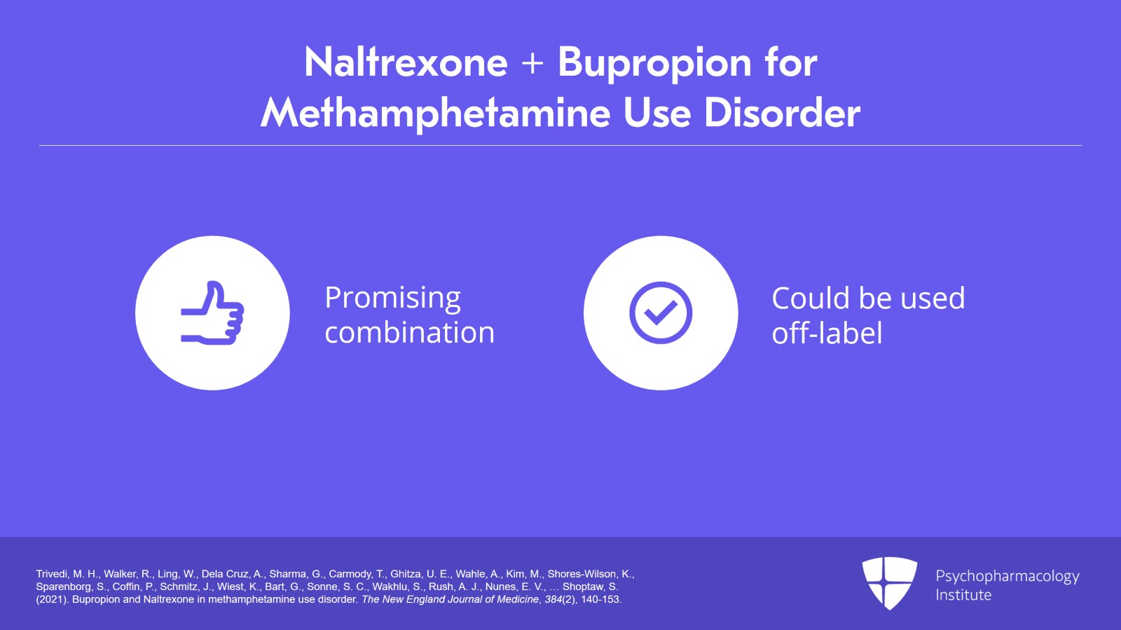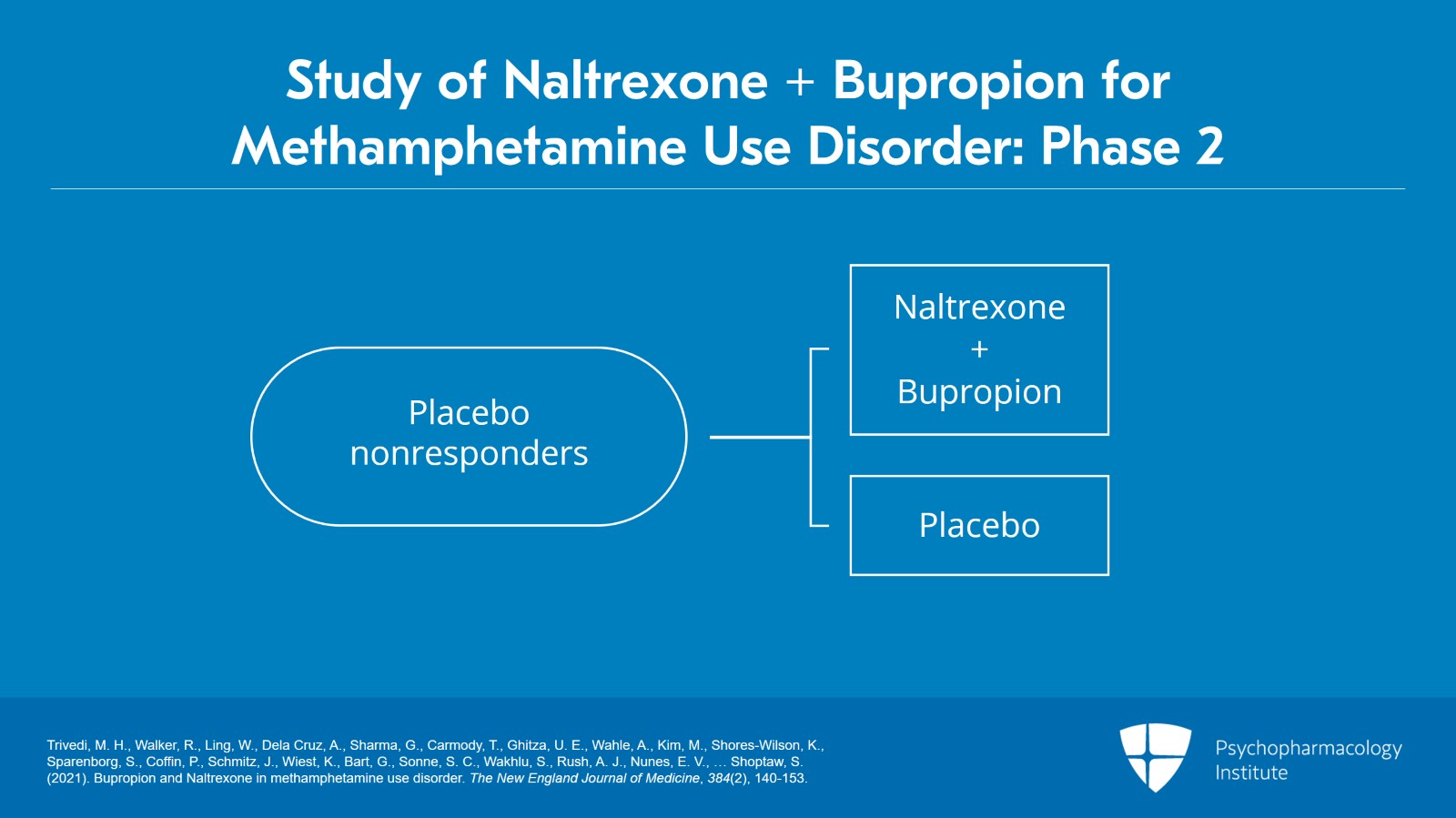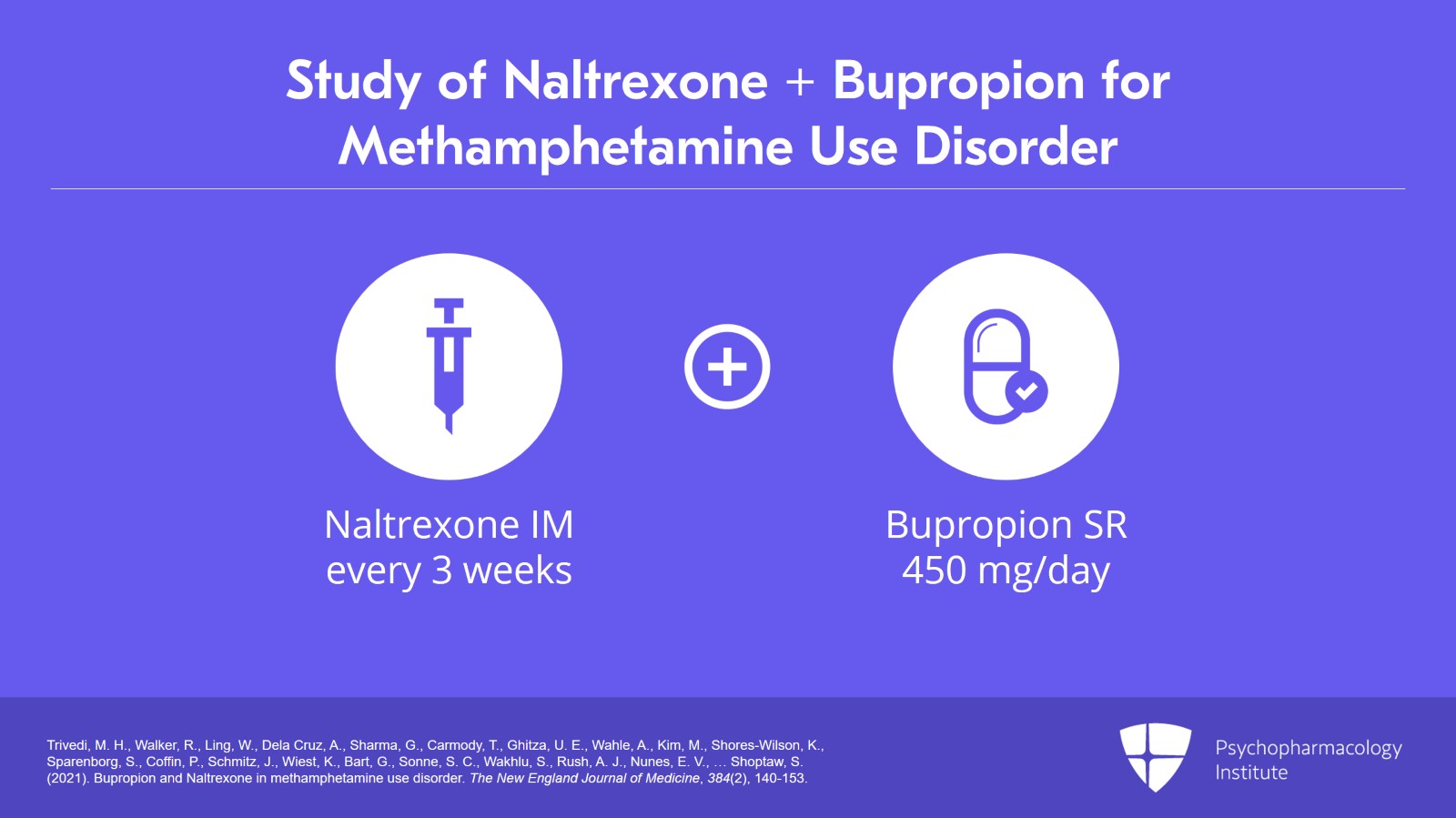 - Trivedi, M. H., Walker, R., Ling, W., Dela Cruz, A., Sharma, G., Carmody, T., Ghitza, U. E., Wahle, A., Kim, M., Shores-Wilson, K., Sparenborg, S., Coffin, P., Schmitz, J., Wiest, K., Bart, G., Sonne, S. C., Wakhlu, S., Rush, A. J., Nunes, E. V., … Shoptaw, S. (2021). Bupropion and Naltrexone in methamphetamine use disorder. The New England Journal of Medicine, 384(2), 140-153.