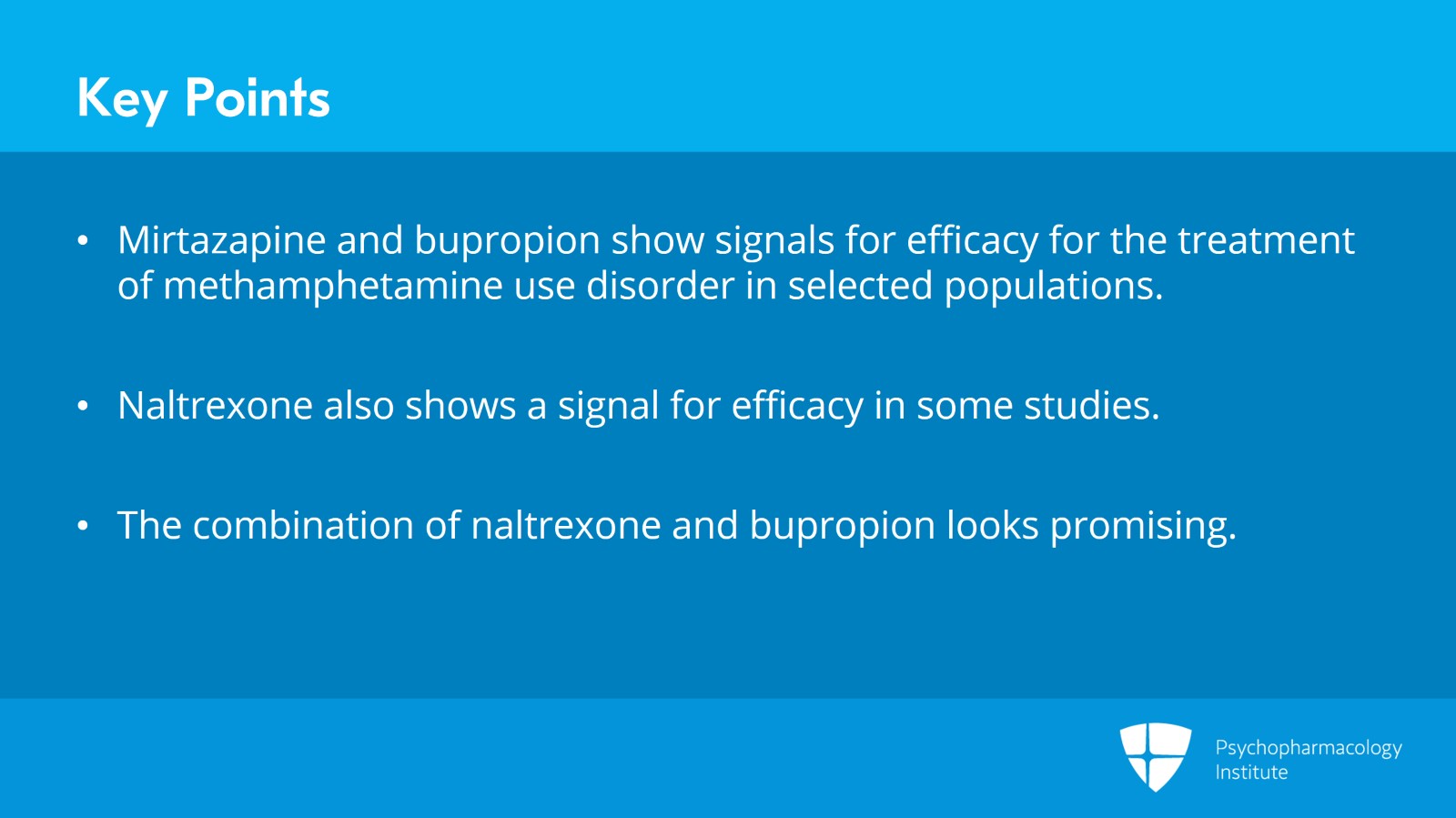 So, the antidepressants, mirtazapine, and bupropion, show some signal for efficacy for the treatment of methamphetamine use disorder in selected populations.