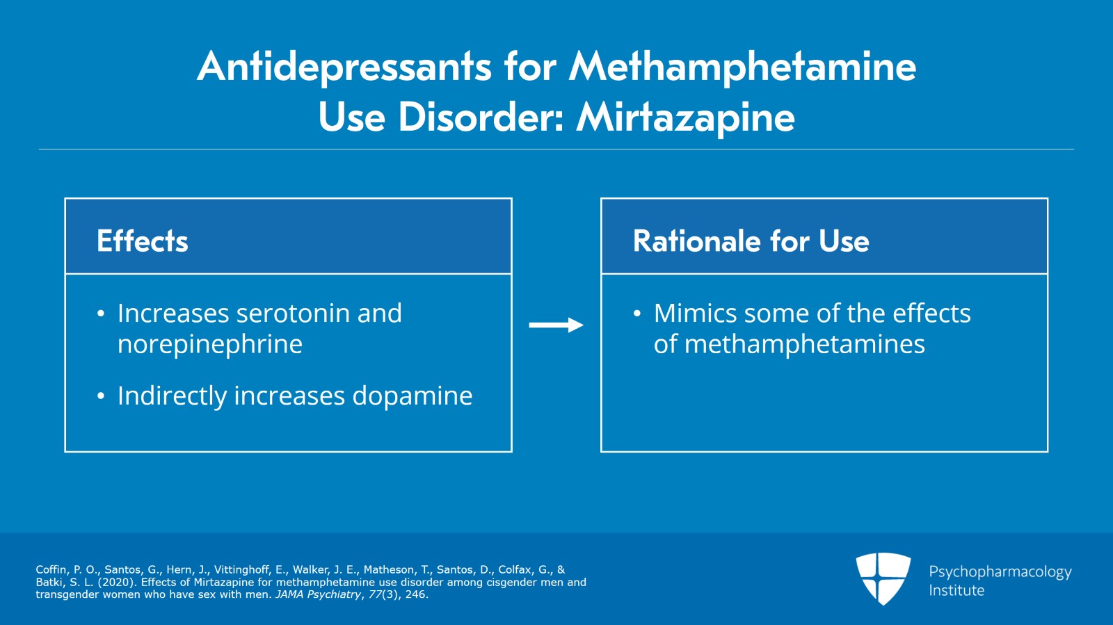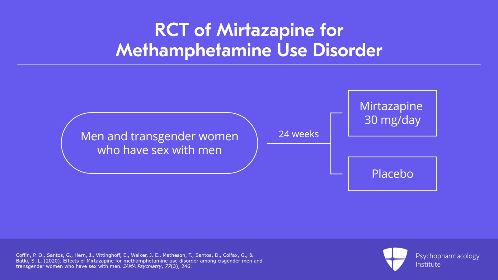 - Coffin, P. O., Santos, G., Hern, J., Vittinghoff, E., Walker, J. E., Matheson, T., Santos, D., Colfax, G., & Batki, S. L. (2020). Effects of Mirtazapine for methamphetamine use disorder among cisgender men and transgender women who have sex with men. JAMA Psychiatry, 77(3), 246.