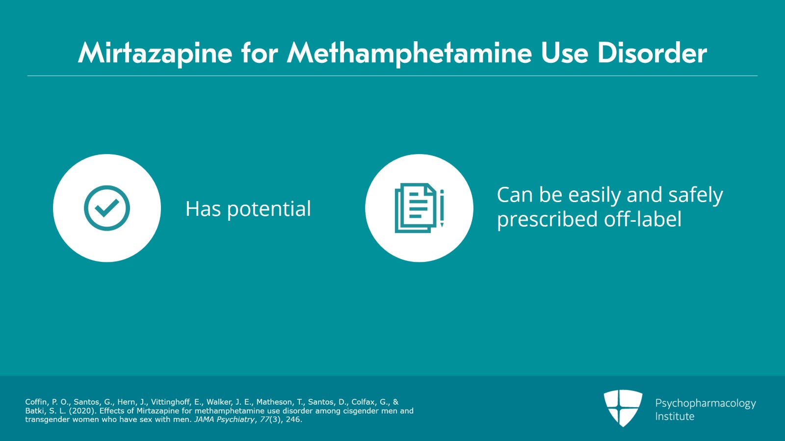 So that’s the rationale for using mirtazapine to treat methamphetamine use disorder because it may mildly mimic some of the effects of methamphetamine while not being euphorigenic.