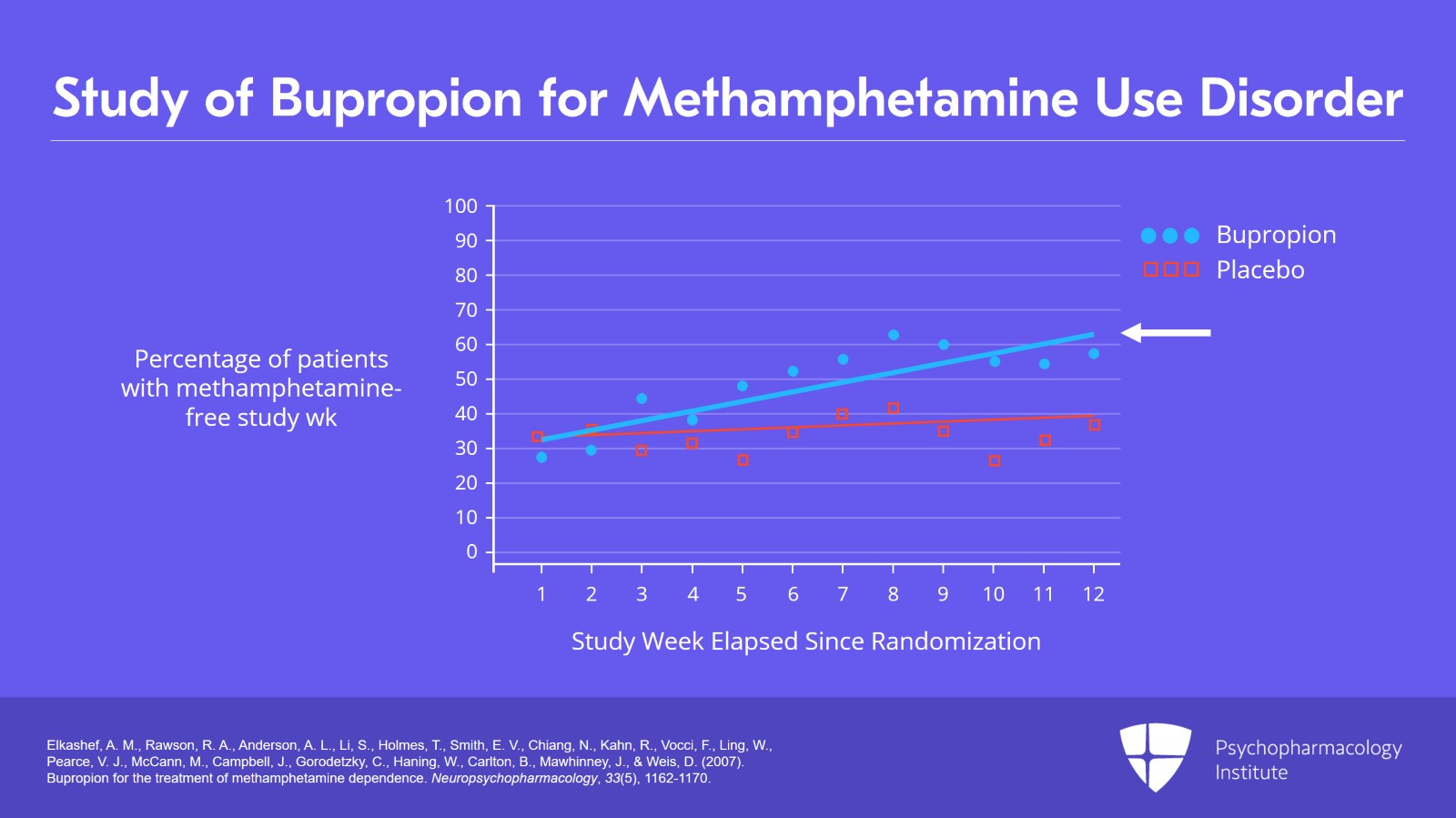- Elkashef, A. M., Rawson, R. A., Anderson, A. L., Li, S., Holmes, T., Smith, E. V., Chiang, N., Kahn, R., Vocci, F., Ling, W., Pearce, V. J., McCann, M., Campbell, J., Gorodetzky, C., Haning, W., Carlton, B., Mawhinney, J., & Weis, D. (2007). Bupropion for the treatment of methamphetamine dependence. Neuropsychopharmacology, 33(5), 1162-1170.