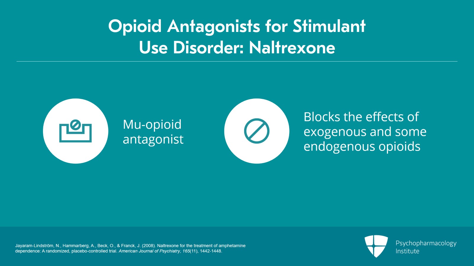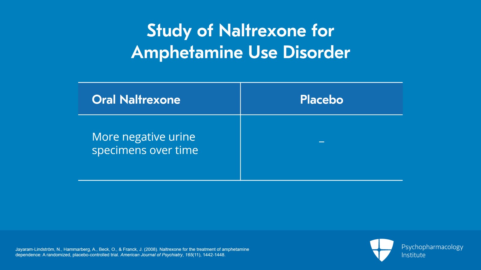 - Jayaram-Lindström, N., Hammarberg, A., Beck, O., & Franck, J. (2008). Naltrexone for the treatment of amphetamine dependence: A randomized, placebo-controlled trial. American Journal of Psychiatry, 165(11), 1442-1448.