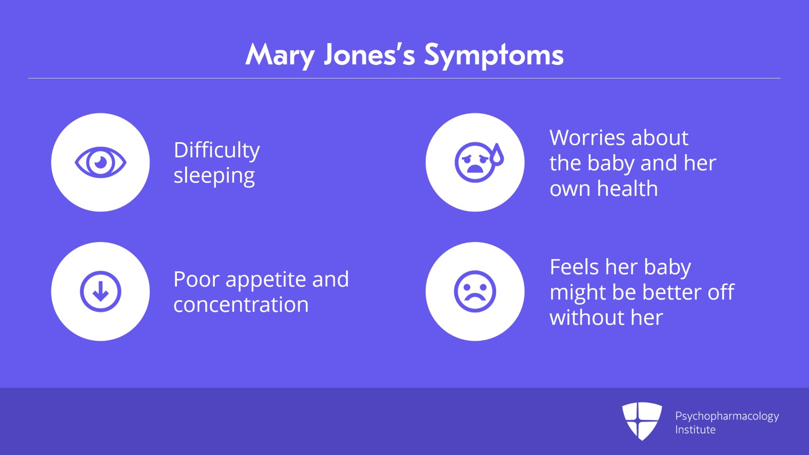 She was referred by her obstetrician for two weeks of difficulty sleeping, worries about the baby and her health, poor appetite and concentration. She feels her baby might be better off without her.