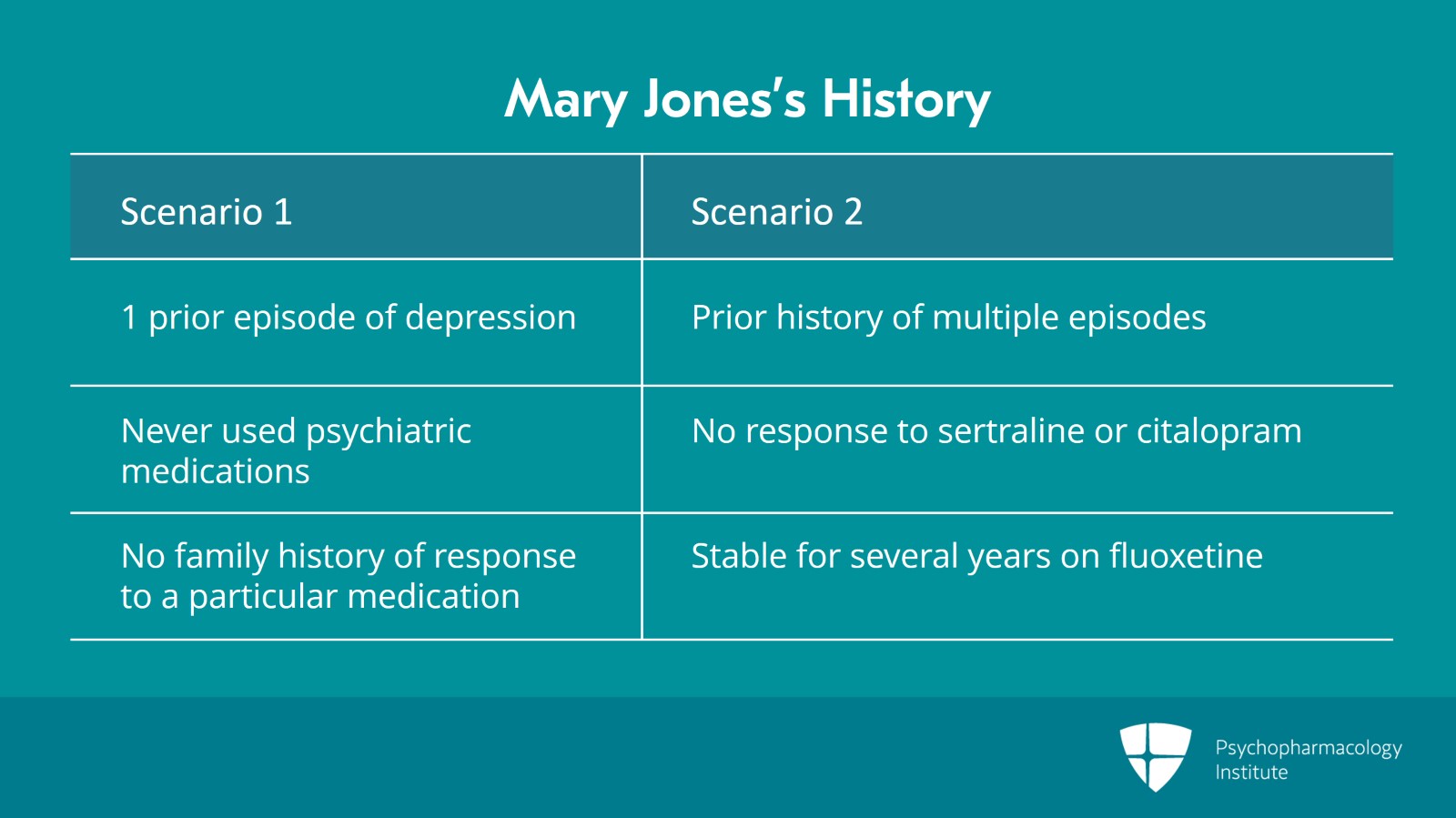 Prior history, let's imagine two different scenarios because they're going to affect what drug we choose. First scenario, this patient has had one prior episode of depression that resolved without treatment. She's never used psychiatric medication. She's got no family history of medication response to a particular medication. Scenario number 2, we're going to give her a prior history of multiple episodes with severe symptoms. She is not responding to sertraline or citalopram in the past, but she was stable for several years on fluoxetine.
