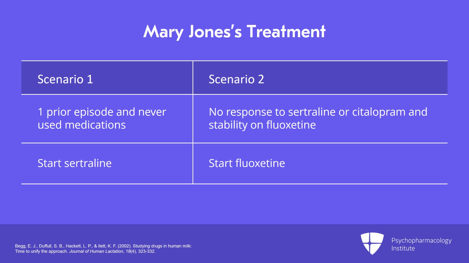 In scenario number 1 where she had one prior episode and never used medications, we'll choose to start the patient on sertraline. It has the best evidence of the lowest passage into the breastmilk, and we'll titrate it up to the therapeutic dose. In scenario number 2, however, where the patient had previously not responded to sertraline or citalopram but had several years of stability on fluoxetine, we would instead start the patient on fluoxetine. Remember there's a theoretical risk of increased adverse reactions due to long half-life but a good history that this works well for the patient.