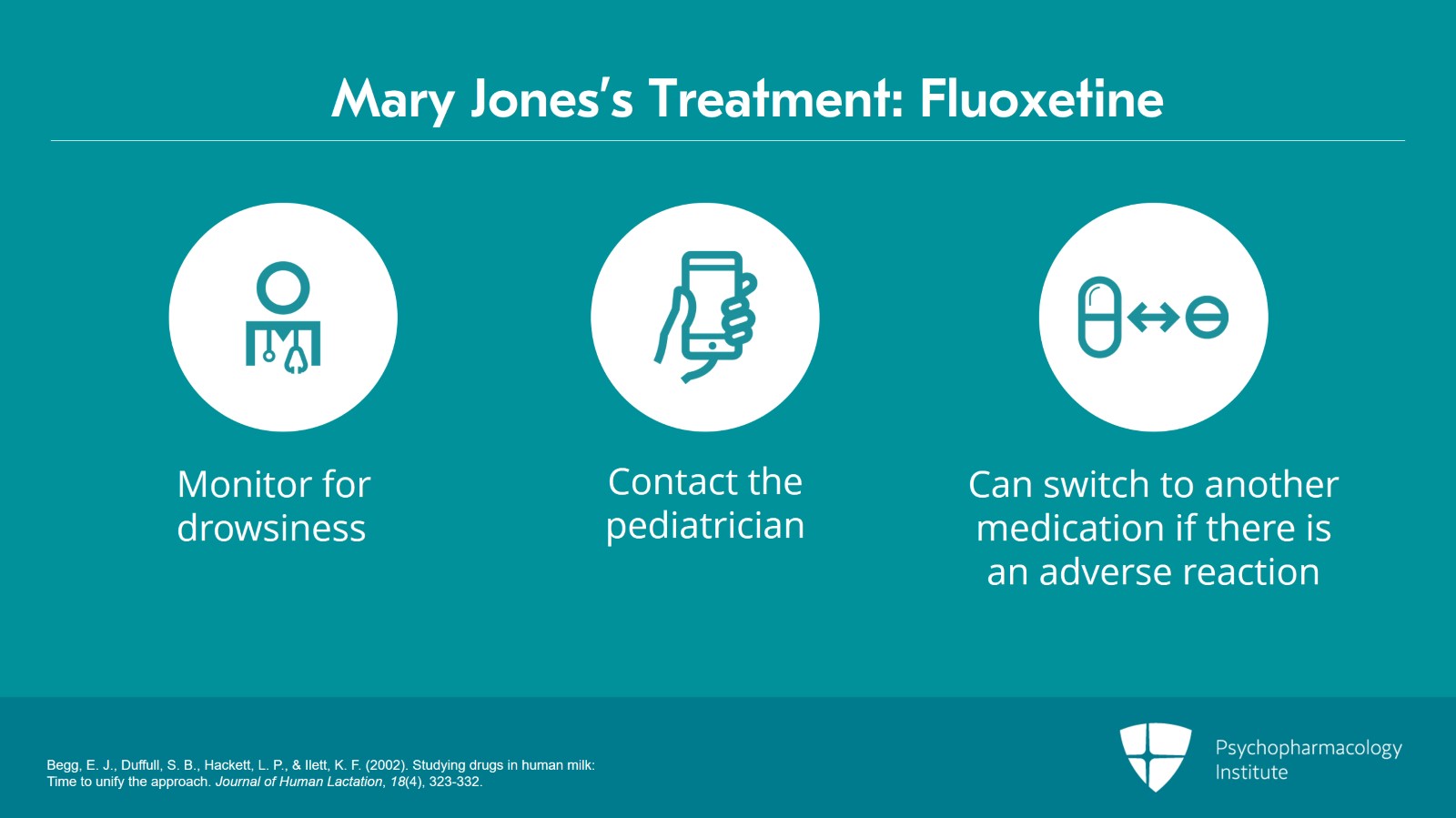 So, we'd try fluoxetine. We'd advise her to monitor the patient for drowsiness. We'd contact the pediatrician to explain our reasoning and we'd watch carefully. We can always switch to something else if there's an adverse reaction, but we know this medication will work best for the mother.