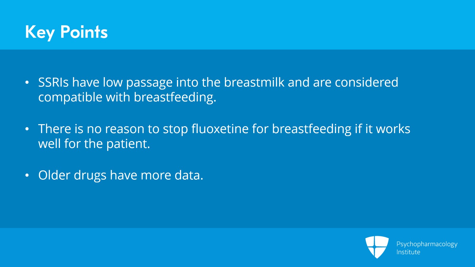 Remember that older drugs have more evidence. So, if you're starting from scratch and you want to use a drug for the first time, choose something that's older because it will have more evidence. For the SSRIs, for example, this means that the older SSRIs are drugs for which we've collected a lot of evidence. Those new drugs that have come out in the last few years, we don't know anything about their use in breastfeeding. Chances are they're fine, but we don't actually have any data.