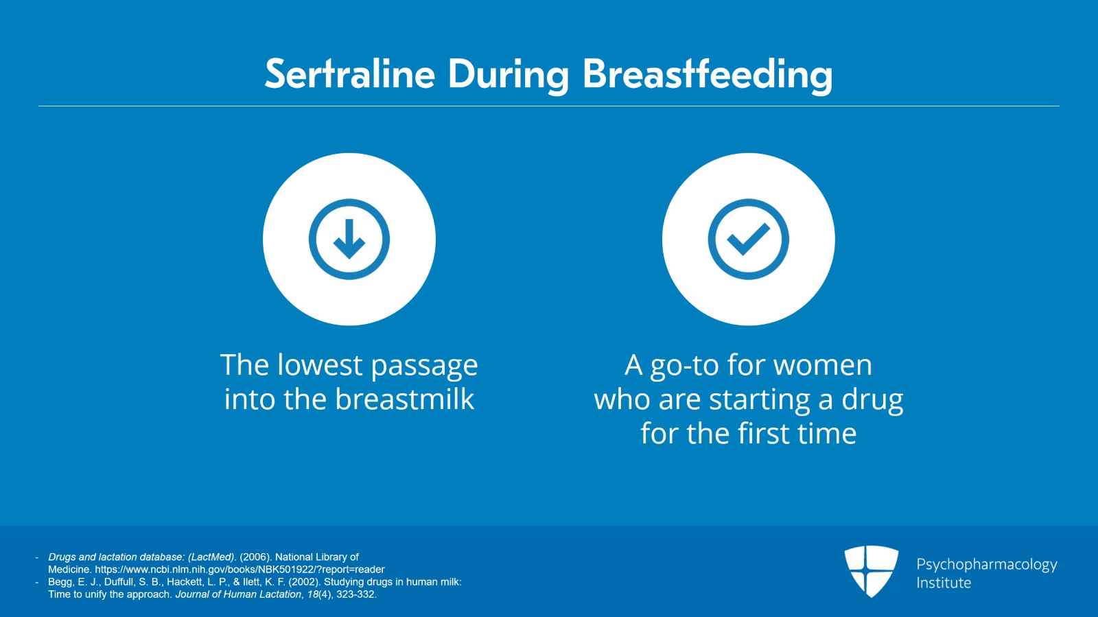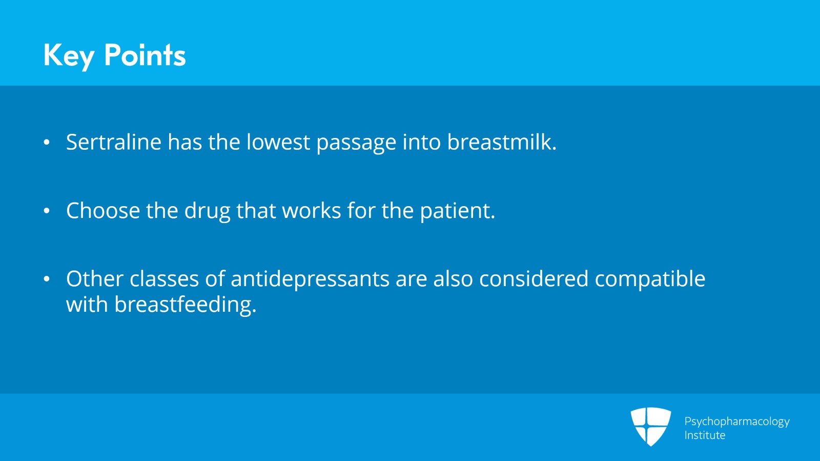 Sertraline is the drug that's probably best studied in breastfeeding and has the lowest passage into breastmilk. So, it's often a go-to for women who are starting a drug for the first time in the postpartum.