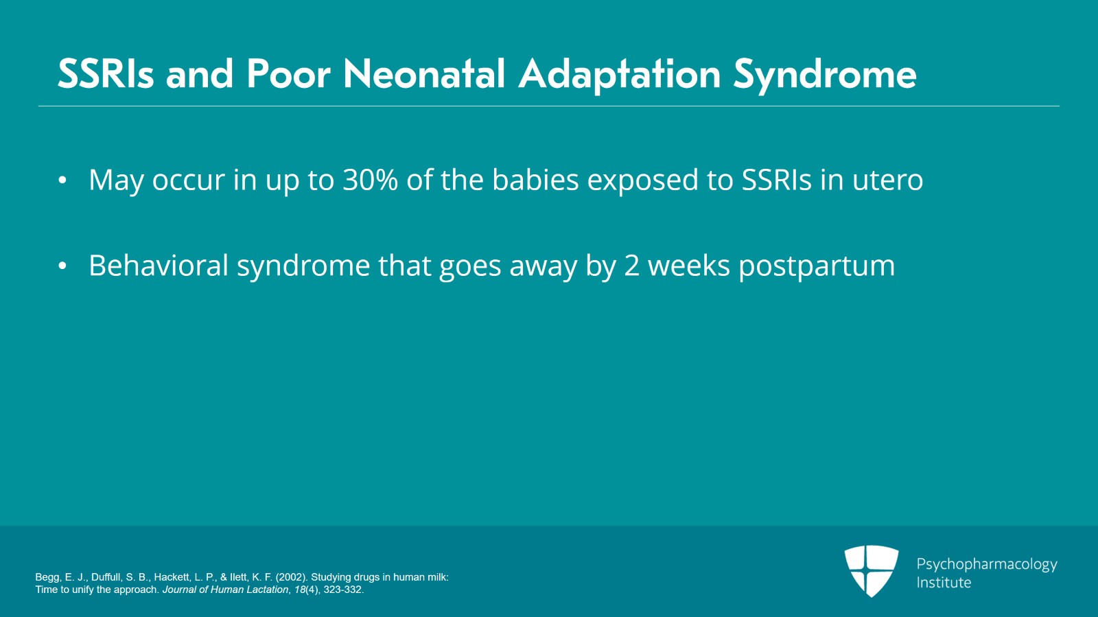 One thing to be aware of is poor neonatal adaptation syndrome which may occur in up to 30% of babies who are exposed to SSRIs in utero. This is a behavioral syndrome that usually goes away by about two weeks postpartum, and it's characterized by fussiness, difficulty feeding and other behavioral symptoms in the postpartum.
