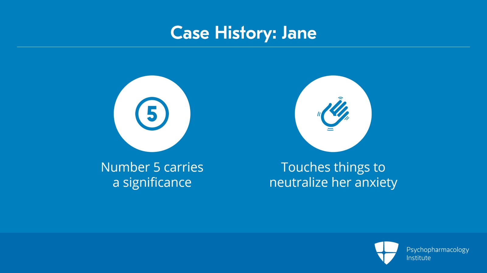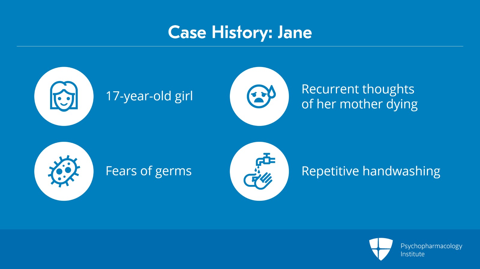 This is a case history. Jane, not her real name, is a 17-year-old girl who first presented to our program for evaluation with a chief complaint of recurrent thoughts and fears of her mother dying as well as fears of germs and dying herself. She exhibited repetitive handwashing and needed to touch things over and over.