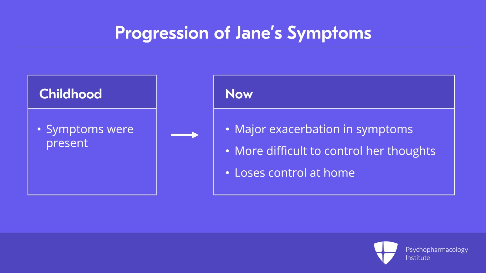 Although these symptoms had been present since early childhood and had been expressed daily for a long time, there was a major exacerbation in her symptoms after she was told by a dental hygienist that she would die if she did not floss her teeth properly because of her history of mitral valve prolapse and the possibility of bacteria getting into her bloodstream. While Jane was able to maintain some control of these thoughts at school, this was becoming more and more difficult, and she would often totally lose control while at home.