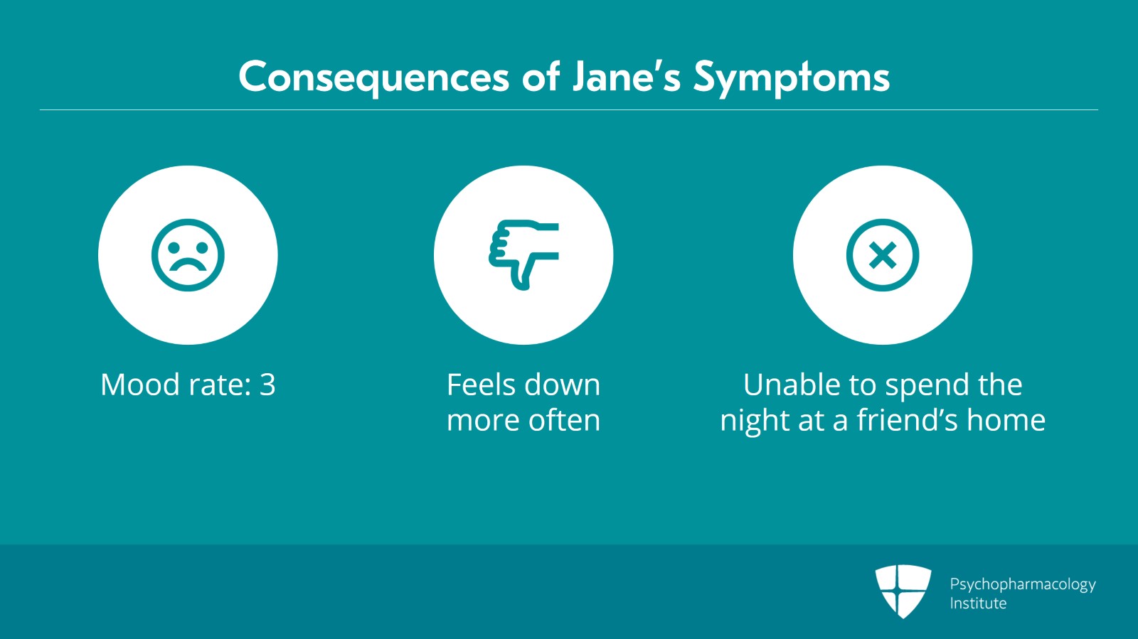 Because of the severity of these symptoms, she rated her mood as a 3 on a scale of 1 to 10 with 1 being worst and 10 being best. She admitted to feeling down more often than not although she denied suicidal ideation. She denied problems with sleep. There was no loss of interest in activities, of hobbies and her appetite remained good. She enjoyed school and her grades had remained good. Although Jane was able to maintain stable friendships, she was unable to spend the night at a friend’s home because her worries increased dramatically when she was away from home at night.