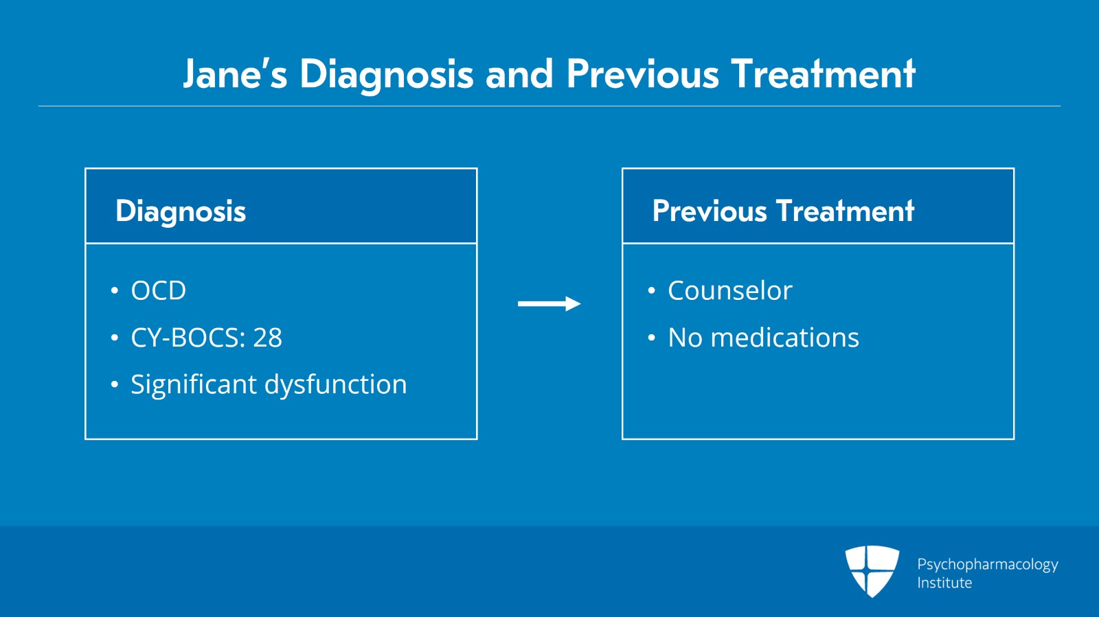 She was diagnosed with obsessive-compulsive disorder. The Children’s Yale-Brown Obsessive-Compulsive Disorder Scale, CY-BOCS rating was 28. The scale ranges from 0 to 40 with scores over 12 being considered clinically significant and scores of 20 and above representing significant dysfunction. Jane had seen a counselor previously but had received no medication for her symptoms. This had not resulted in relief of her symptoms. 6