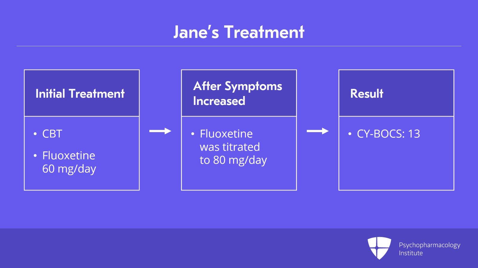 She reached an optimal dose that led to a dramatic decrease in symptom severity and symptom remission.   After relapse in her OCD symptoms and after failure of CBT booster sessions to ameliorate her symptoms, her SSRI dose was again gradually titrated to an optimal level that led to remission of her OCD symptoms.