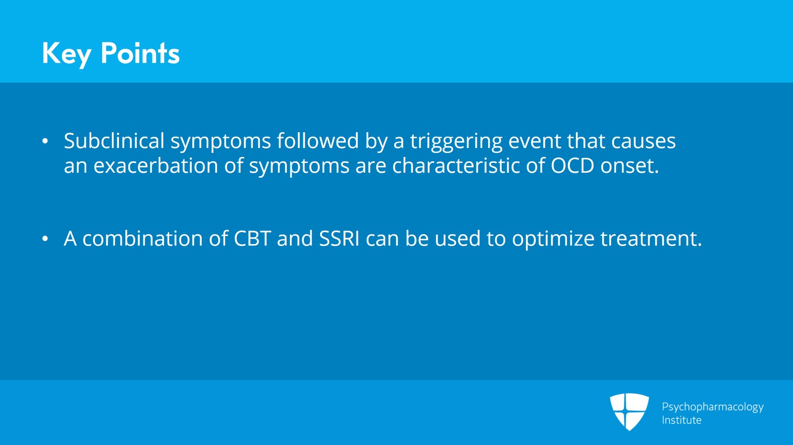 Key points. The course of illness described above where subclinical symptoms are followed by triggering event which causes an exacerbation of symptoms is characteristic of the onset of many OCD cases. Combination of CBT and SSRI treatment was optimized using a titration approach over the course of seven weeks.