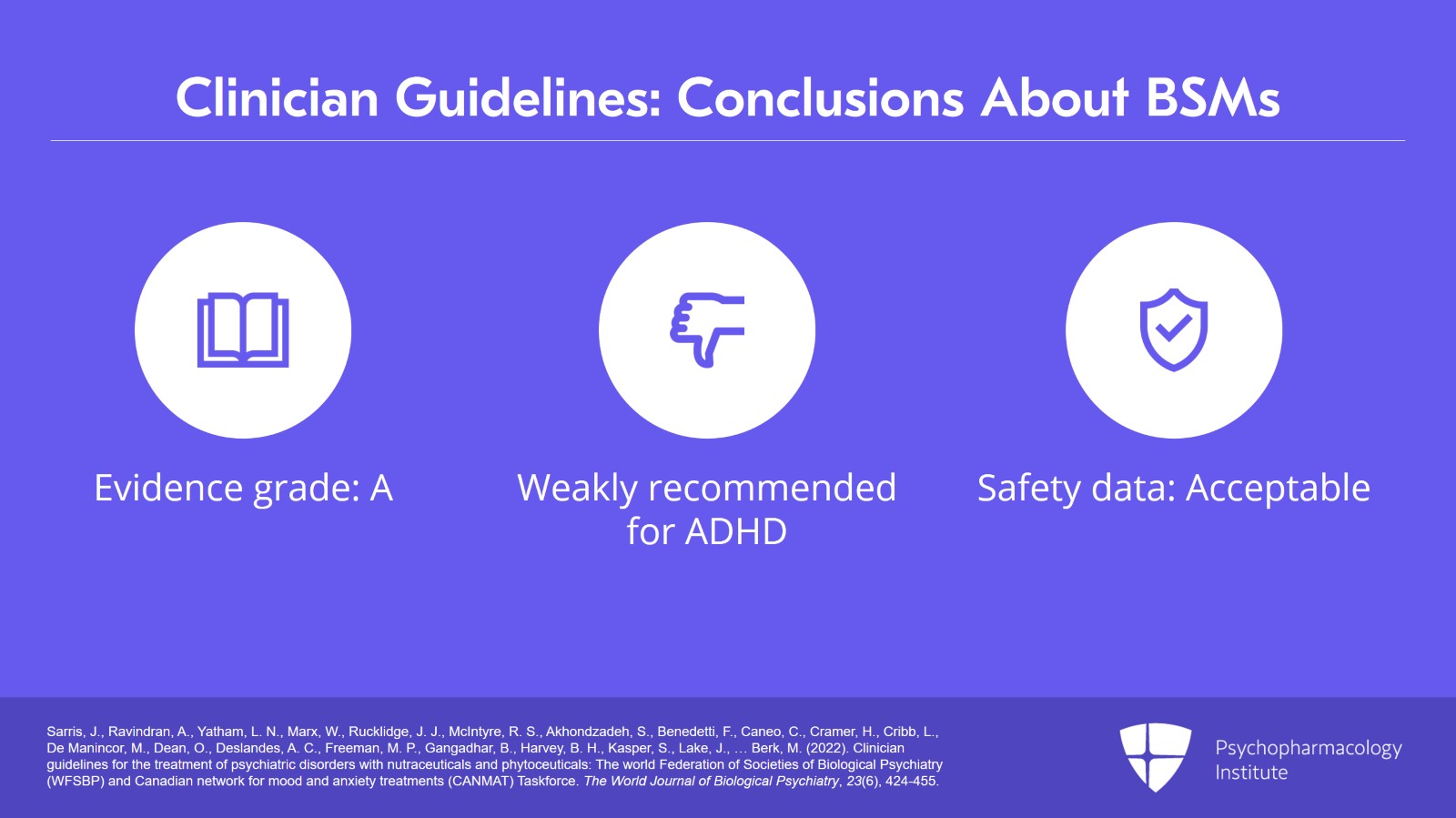 The World Federation of Societies of Biological Psychiatry and the Canadian Network for Mood and Anxiety Treatments task force developed clinician guidelines for the treatment of psychiatric disorders with nutraceuticals and phytoceuticals and concluded that micronutrients had an evidence grade of A given the two RCTs that had been published at the time of the writing of the guidelines as well as the meta-analysis showing supportive evidence of efficacy in ADHD as monotherapy, one in children and one in adults. They rated the strength of recommendation for micronutrients as weakly recommend for ADHD. They noted that this particular micronutrient formula's efficacy cannot be extended to other micronutrient formulas and rated the safety data for micronutrients as acceptable.