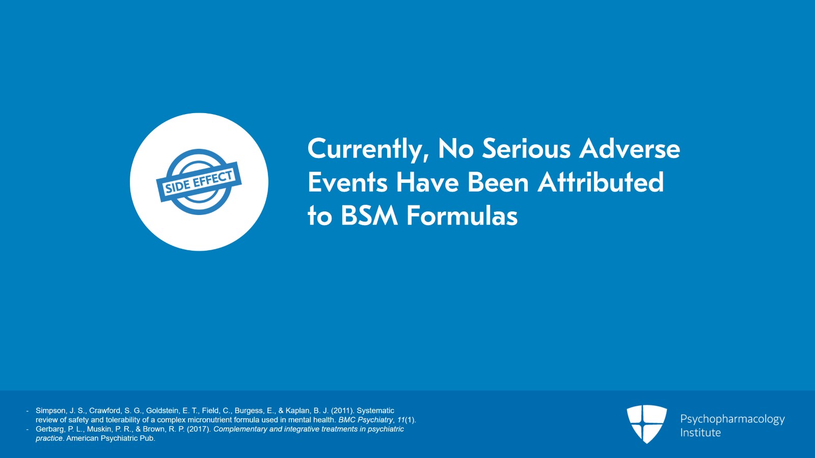 - Simpson, J. S., Crawford, S. G., Goldstein, E. T., Field, C., Burgess, E., & Kaplan, B. J. (2011). Systematic review of safety and tolerability of a complex micronutrient formula used in mental health. BMC Psychiatry, 11(1).
