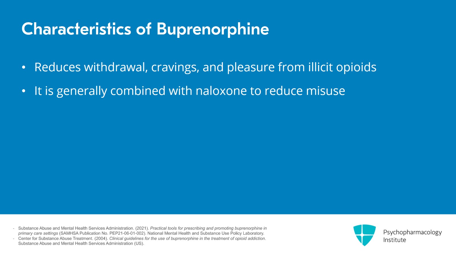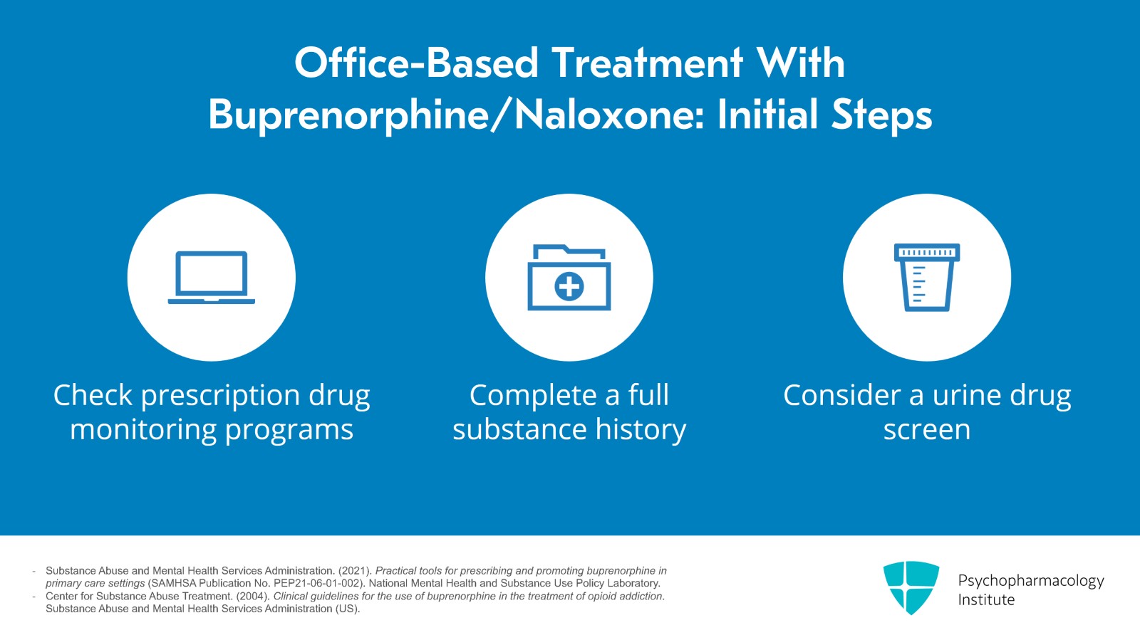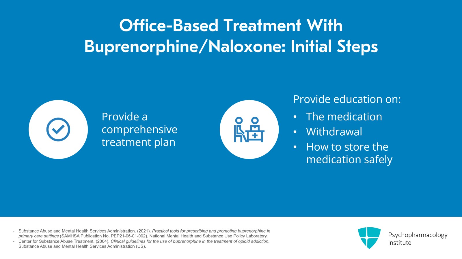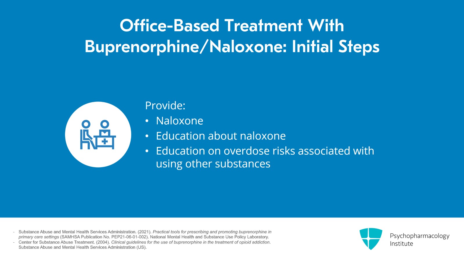 - Substance Abuse and Mental Health Services Administration. (2021). Practical tools for prescribing and promoting buprenorphine in primary care settings (SAMHSA Publication No. PEP21-06-01-002). National Mental Health and Substance Use Policy Laboratory.