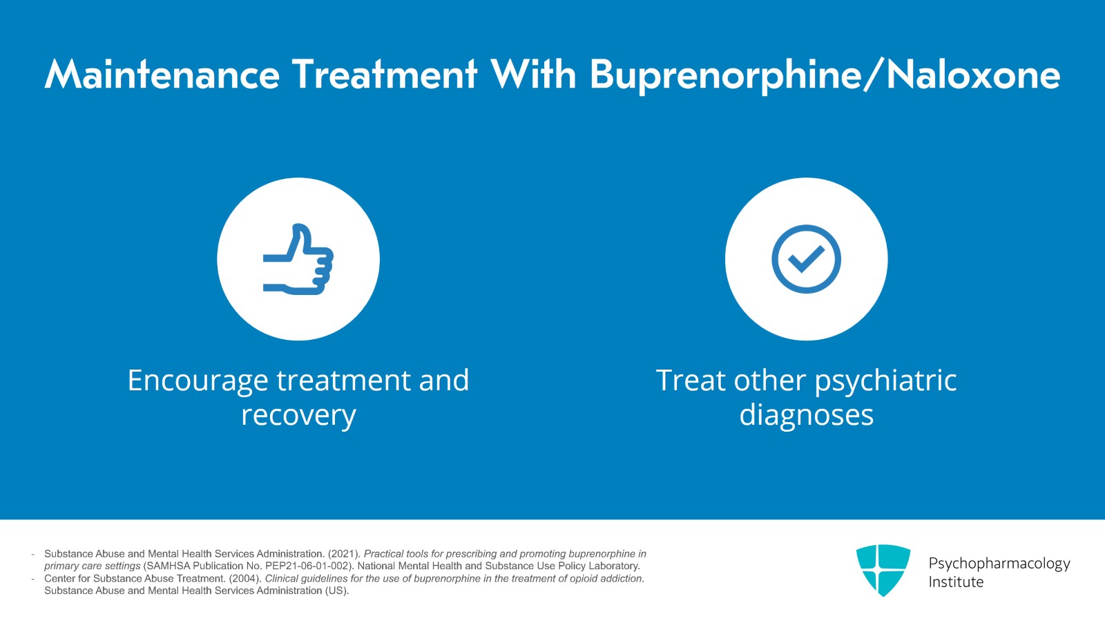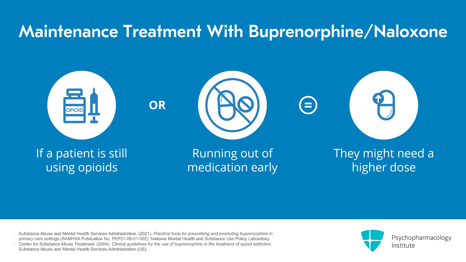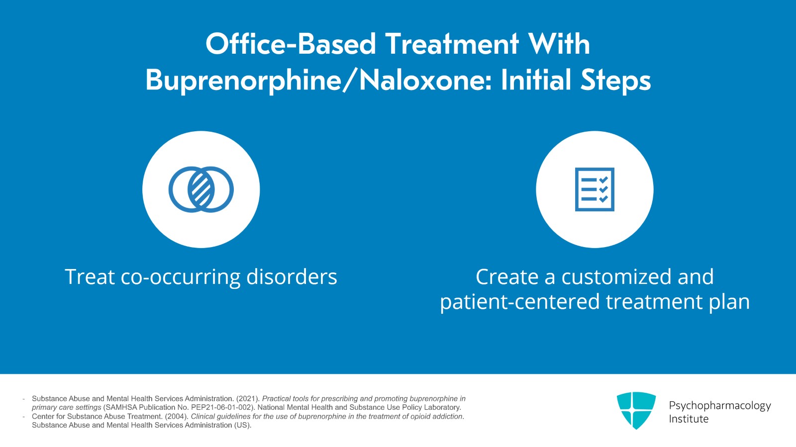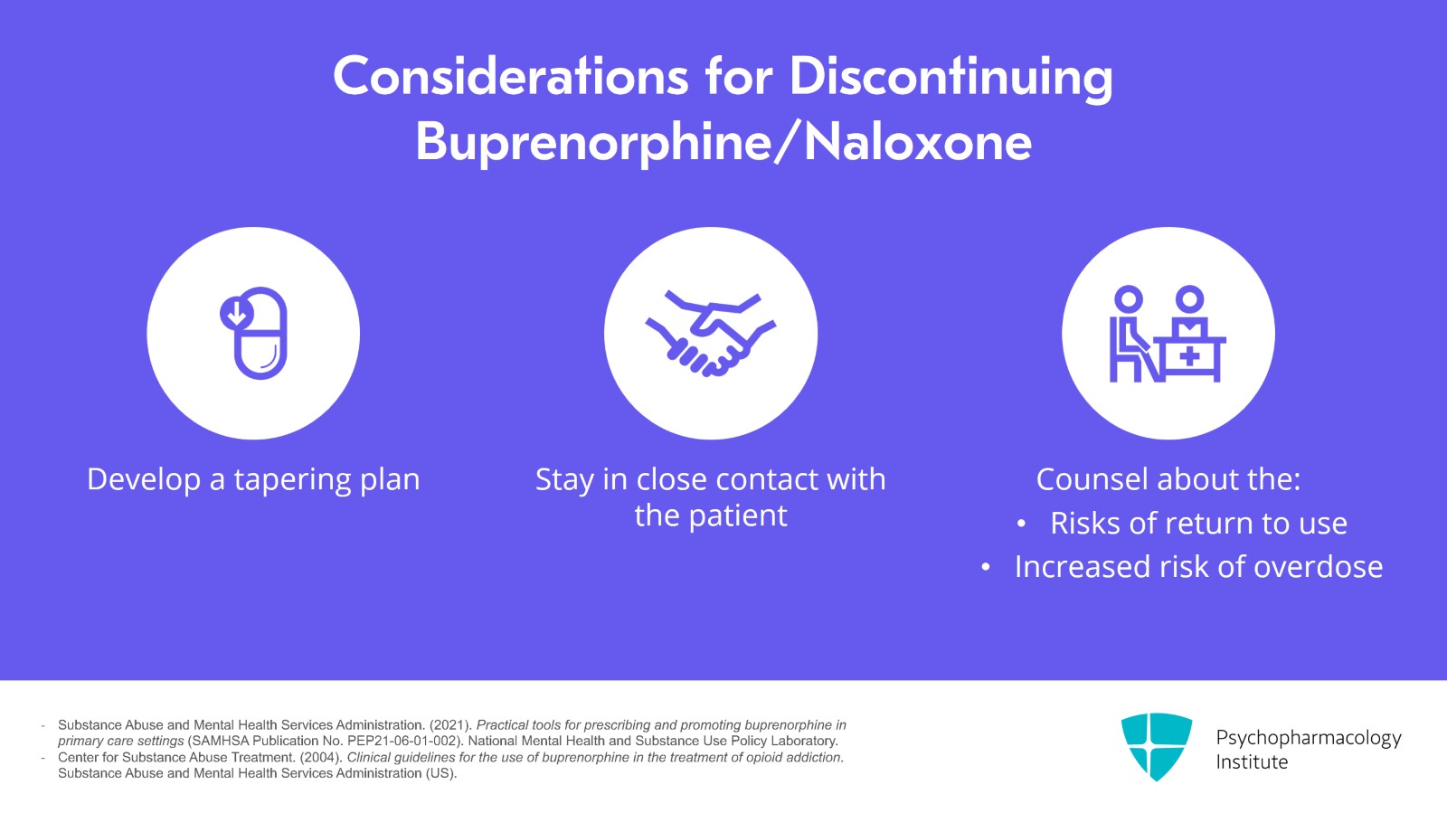 - Substance Abuse and Mental Health Services Administration. (2021). Practical tools for prescribing and promoting buprenorphine in primary care settings (SAMHSA Publication No. PEP21-06-01-002). National Mental Health and Substance Use Policy Laboratory.