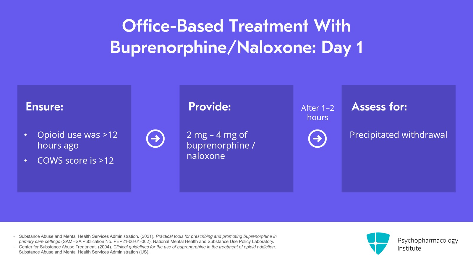 On day 1, we ensure that opioid use was more than 12 hours ago, 36 to 72 hours if they've been on long-acting opioids. A COWS score should be over 12. We provide 2 to 4 mg of the medication and after an hour or two assess for precipitated withdrawal.