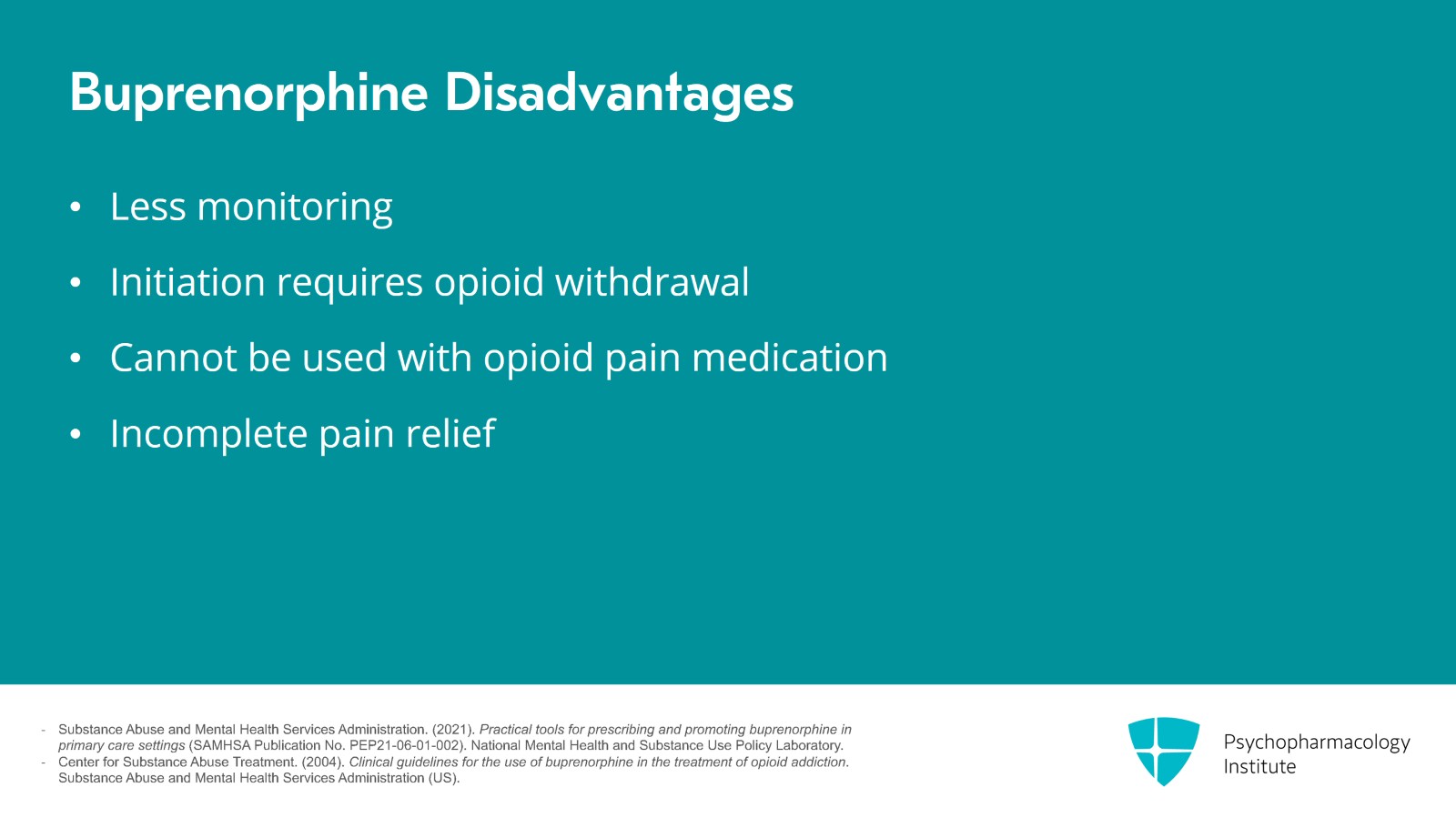 I've talked a lot about the advantages of buprenorphine but I will list a few disadvantages. For some of our patients, having more structure is helpful. Therefore, less monitoring isn't always desirable. Another major issue is that somebody needs to be in opioid withdrawal to start which can be really hard for many of our patients. Buprenorphine is also a blocker of opioid pain medications. So if somebody needs to be on them down the line, they must get off of buprenorphine. Finally, when it comes to pain, a lot of people find some relief from buprenorphine but not complete. For those, methadone may be preferred.