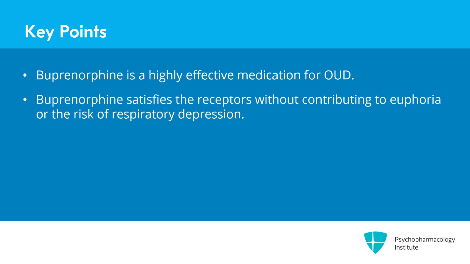 To summarize key points, buprenorphine is an extremely effective medication for opioid use disorder. As an opioid receptor partial agonist, it satisfies the receptors without contributing to euphoria as well as the risk of respiratory depression compared to methadone.