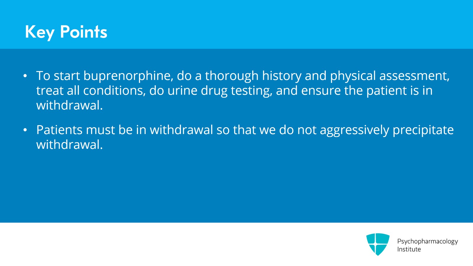 In order to start the medication, we should do a thorough history and physical assessment, treat all conditions, do urine drug testing and ensure that somebody is in withdrawal. They must be in withdrawal so that we do not very aggressively precipitate withdrawal.
