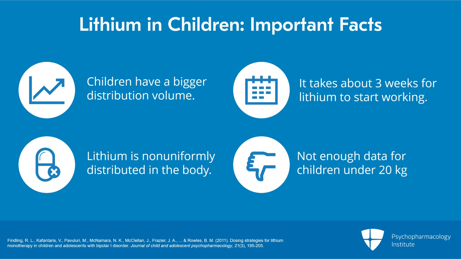 - Findling, R. L., Kafantaris, V., Pavuluri, M., McNamara, N. K., McClellan, J., Frazier, J. A., … & Rowles, B. M. (2011). Dosing strategies for lithium monotherapy in children and adolescents with bipolar I disorder. Journal of child and adolescent psychopharmacology, 21(3), 195-205.