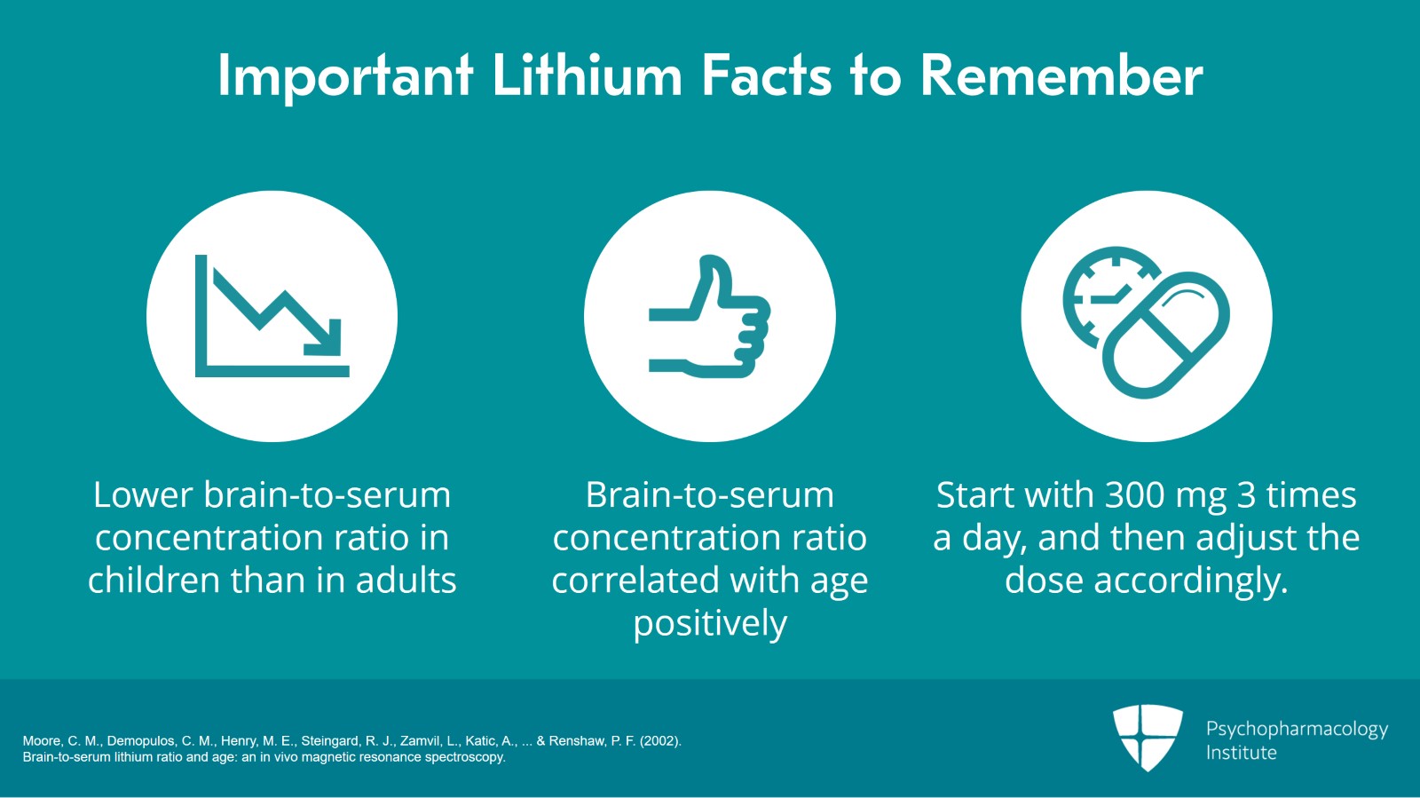 - Moore, C. M., Demopulos, C. M., Henry, M. E., Steingard, R. J., Zamvil, L., Katic, A., … & Renshaw, P. F. (2002). Brain-to-serum lithium ratio and age: an in vivo magnetic resonance spectroscopy.