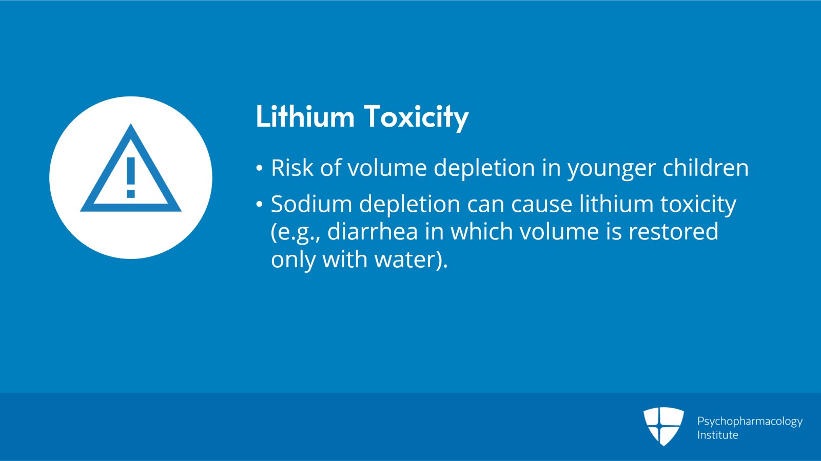 Also, as we know, lithium depends also on the sodium balance in the body for its excretion. And hence, sodium depletion can cause lithium toxicity. So for example, children who have diarrhea that is replenished only with water, free water that is, can also be sodium depleted and that can hinder the excretion of lithium from the kidneys and then that can cause lithium toxicity.