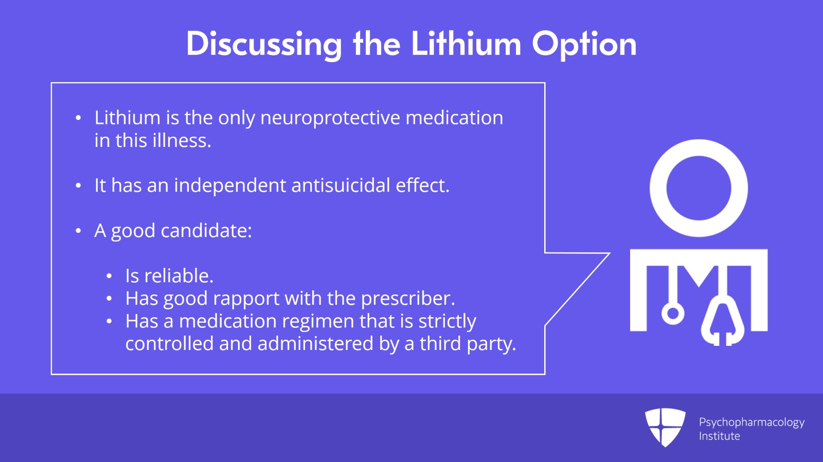 One last important clinical pearl about lithium that we have to keep in the back of our minds as we discuss this option with families is that lithium, to the best of our knowledge, is the only medication that we know of that is neuroprotective in this illness. Hence, we should give it a serious consideration especially that it also has an additional power of having an independent anti-suicidal effect. Hence, a good candidate for treatment with lithium would be a youngster, a child or a teenager who is extremely reliable and has a good rapport and working relationship with the prescriber and also has a medication regimen that is strictly controlled and administered by a third party such as his parents or his guardians or his school system, for example. This would minimize the risk of a serious overdose on this medication in addition to also the very well-known effect of rebound suicidality if this medication is stopped abruptly.