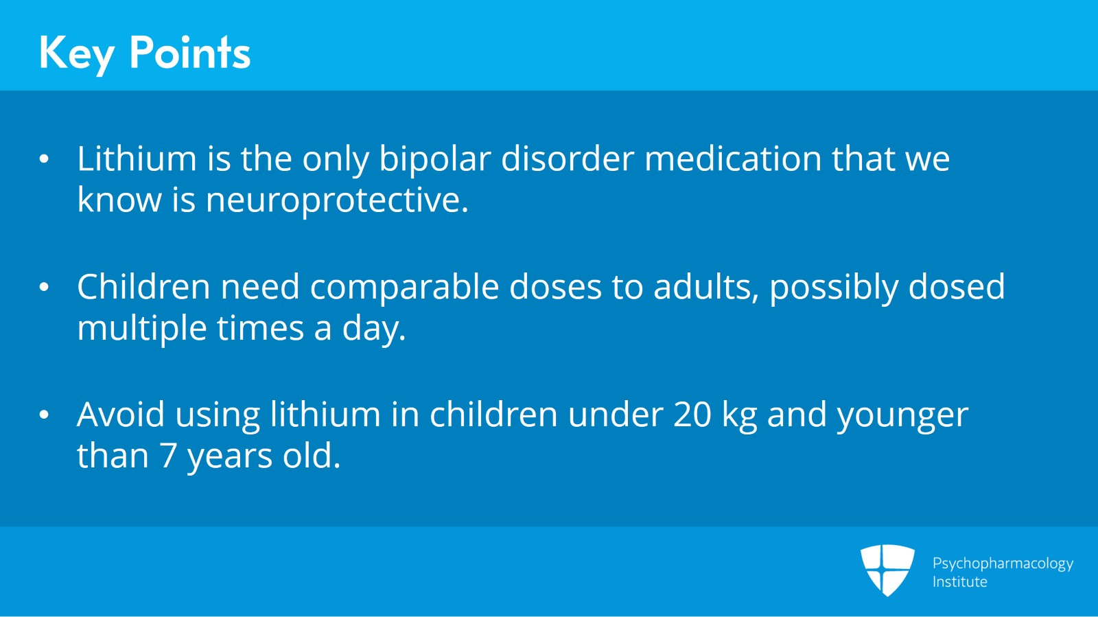 To summarize, some key points about prescribing lithium. Number one, lithium is the only bipolar disorder medication that we know of that is neuroprotective. Number two, children need comparable doses to adults, not lower doses than adults and possibly the medication needs to be dosed multiple times a day. Number three, we should avoid using this medication in children with lower weights such as weight lower than 20 kg and younger age, those children who are 7 years or younger because we have little data on this patient population.