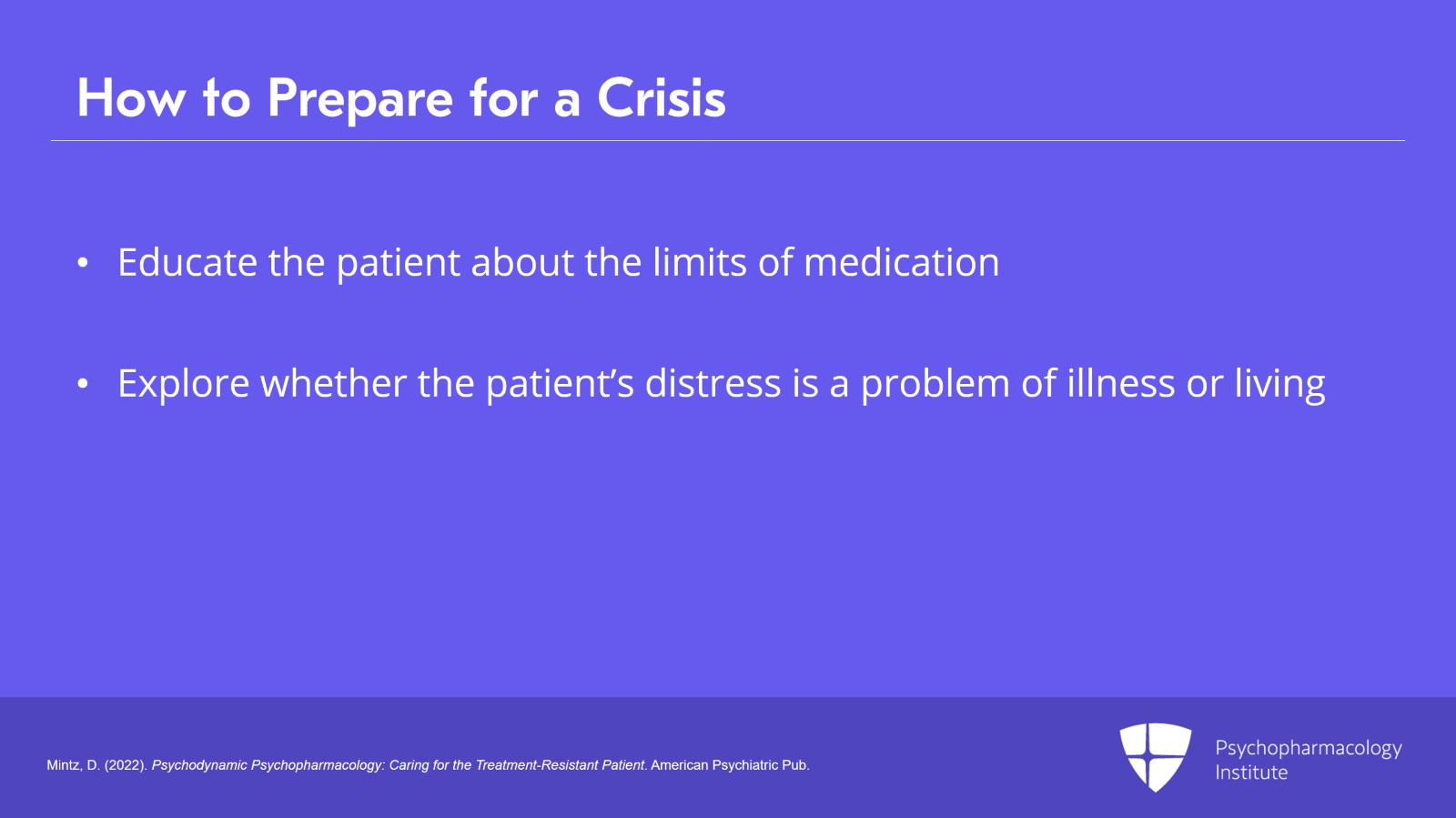 There are some other things I think we can do, especially before the crisis. We want to educate the patient about the actual limits of medications, some of the ways that they can become permanent solutions to temporary problems, especially in our kinds of patients who come in to us already on a raft of medications that seems kind of irrational in the beginning. We may want to explore whether the patient's distress is a problem of illness or a problem of living, is it really about depression, or is it that they have a maladaptive response to real stressors in the world, and we need to help them actually develop a better response to those real stressors or injustices that they're facing?